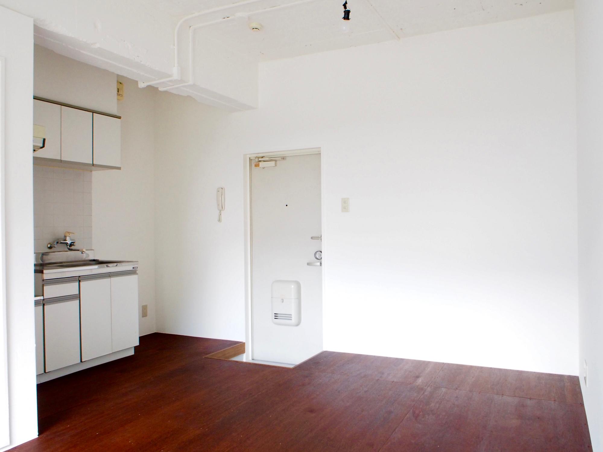 内装はスケルトンのダクト剥き出し/白塗装/床は濃いめフローリングと海外のロフトっぽい仕上がり。