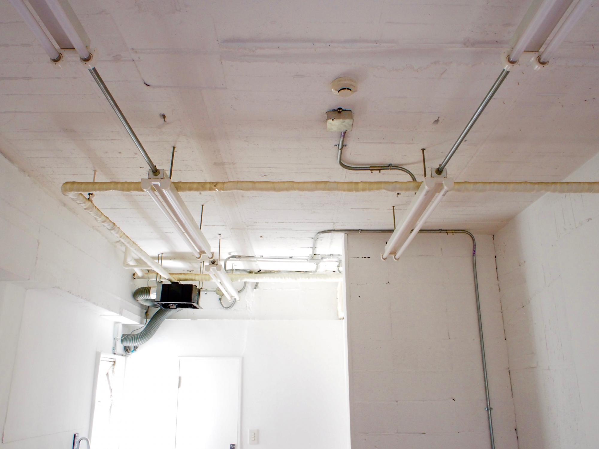 内装はスケルトンのダクト剥き出し/白塗装/床は濃いめフローリングと海外のロフトっぽい仕上がり。