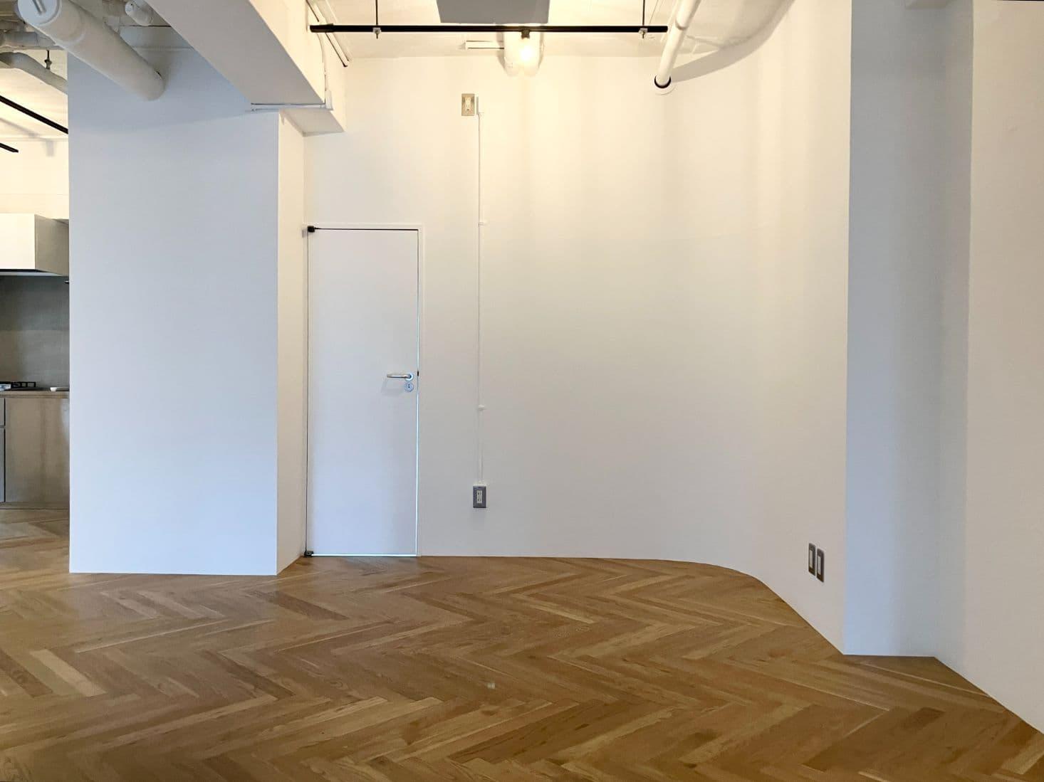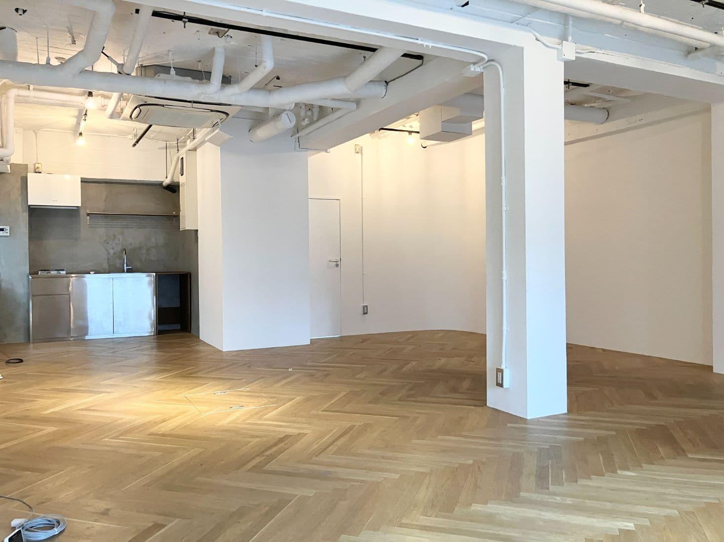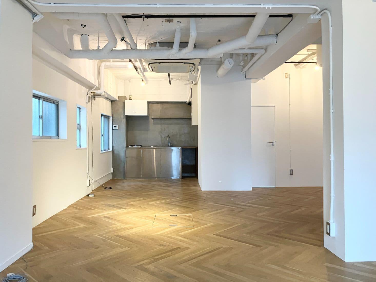 内装はスケルトンのダクト剥き出し、白塗装、床は可愛らしいヘリボーンでお仕上げ。
