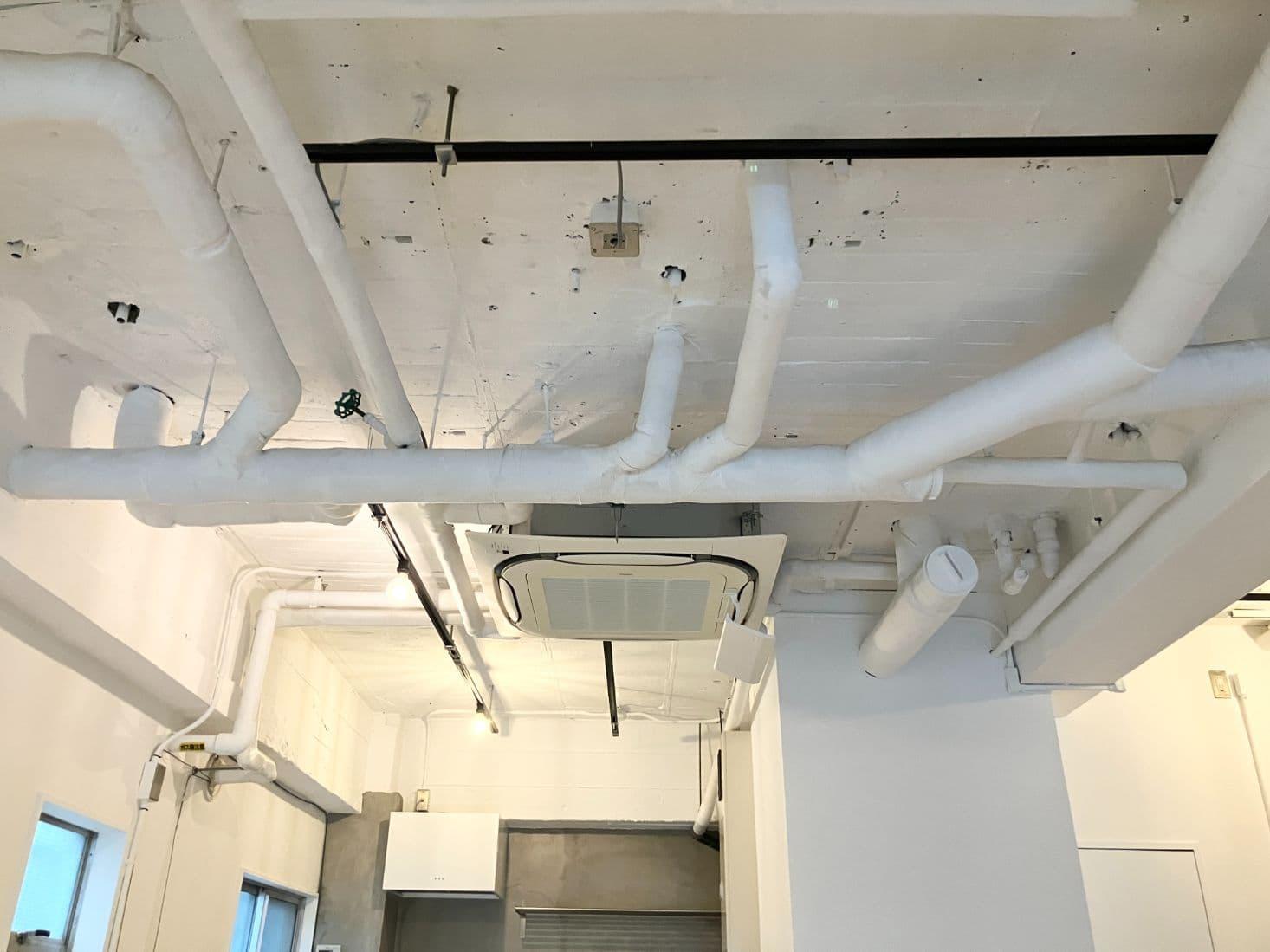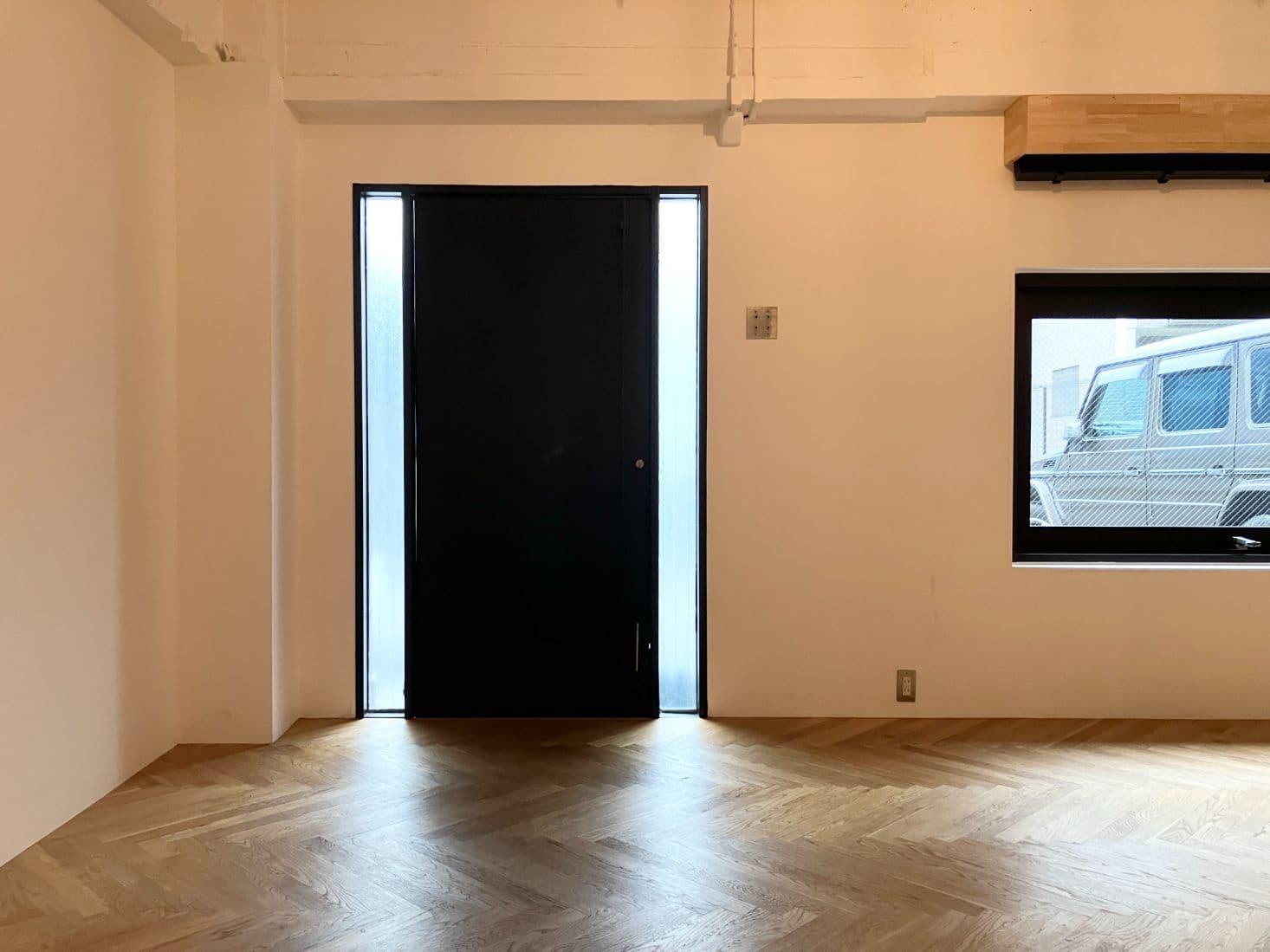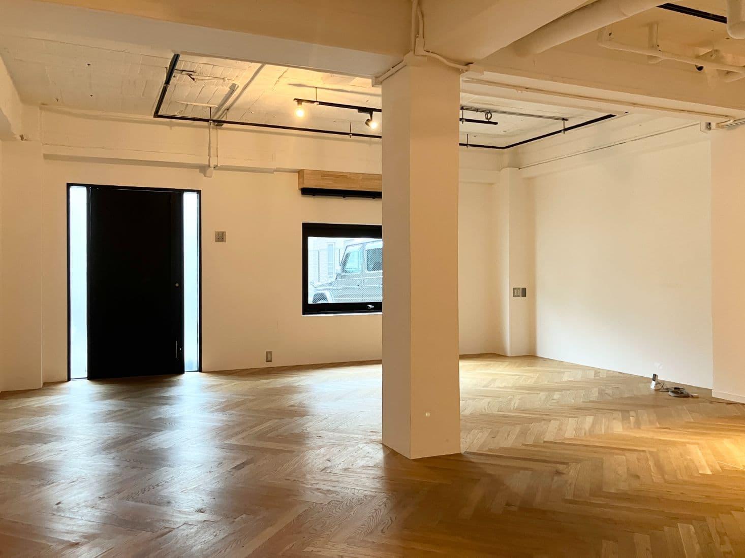 内装はスケルトンのダクト剥き出し、白塗装、床は可愛らしいヘリボーンでお仕上げ。