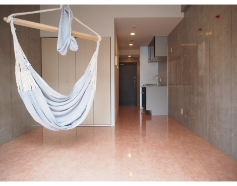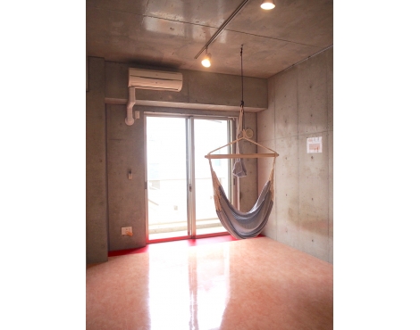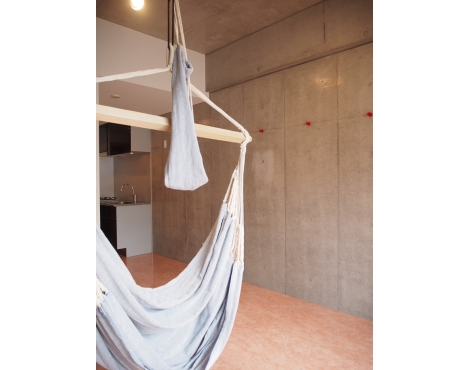 無骨な空間にぶら下がる一本のハンモック