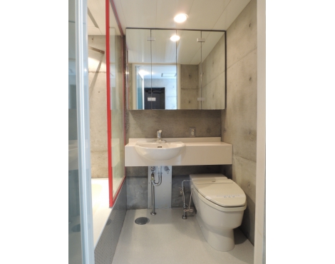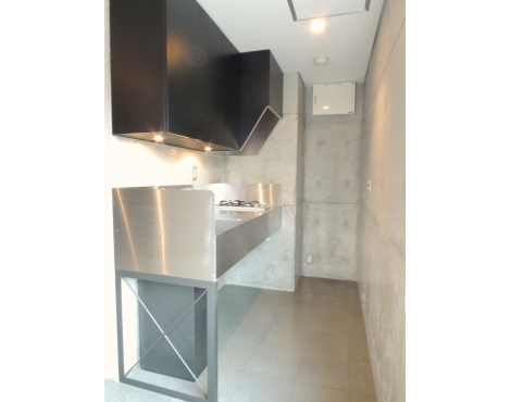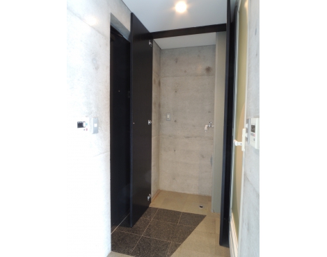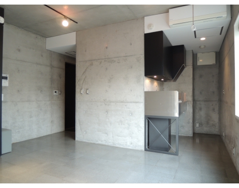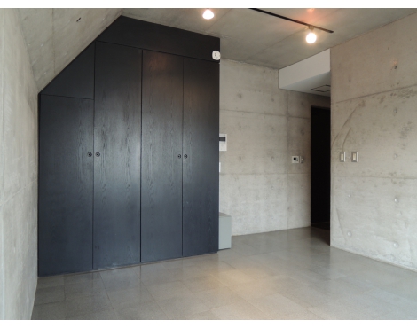打ちっぱなしのコンクリートに、グレーのPタイルで、収納もマットな黒色。