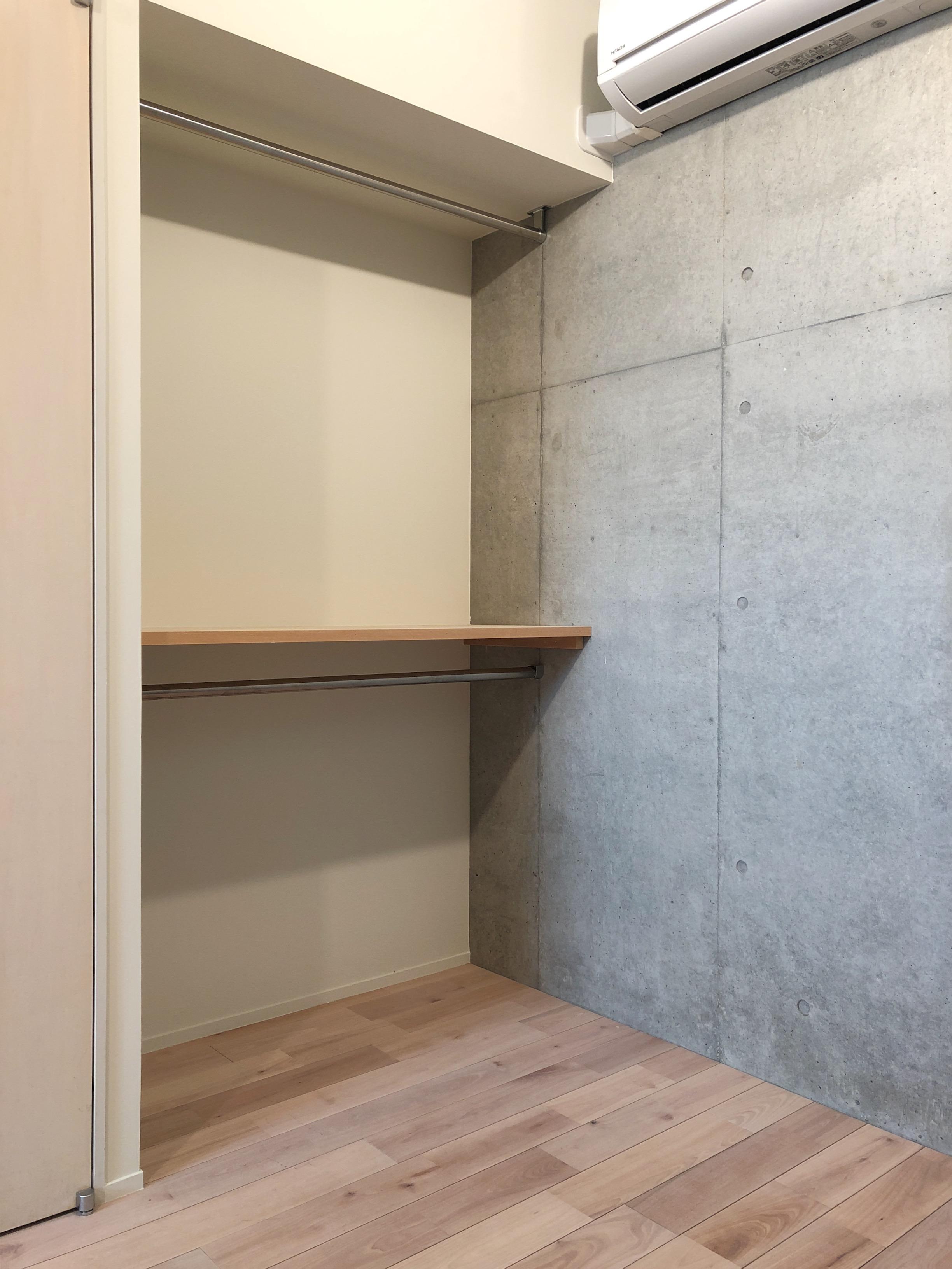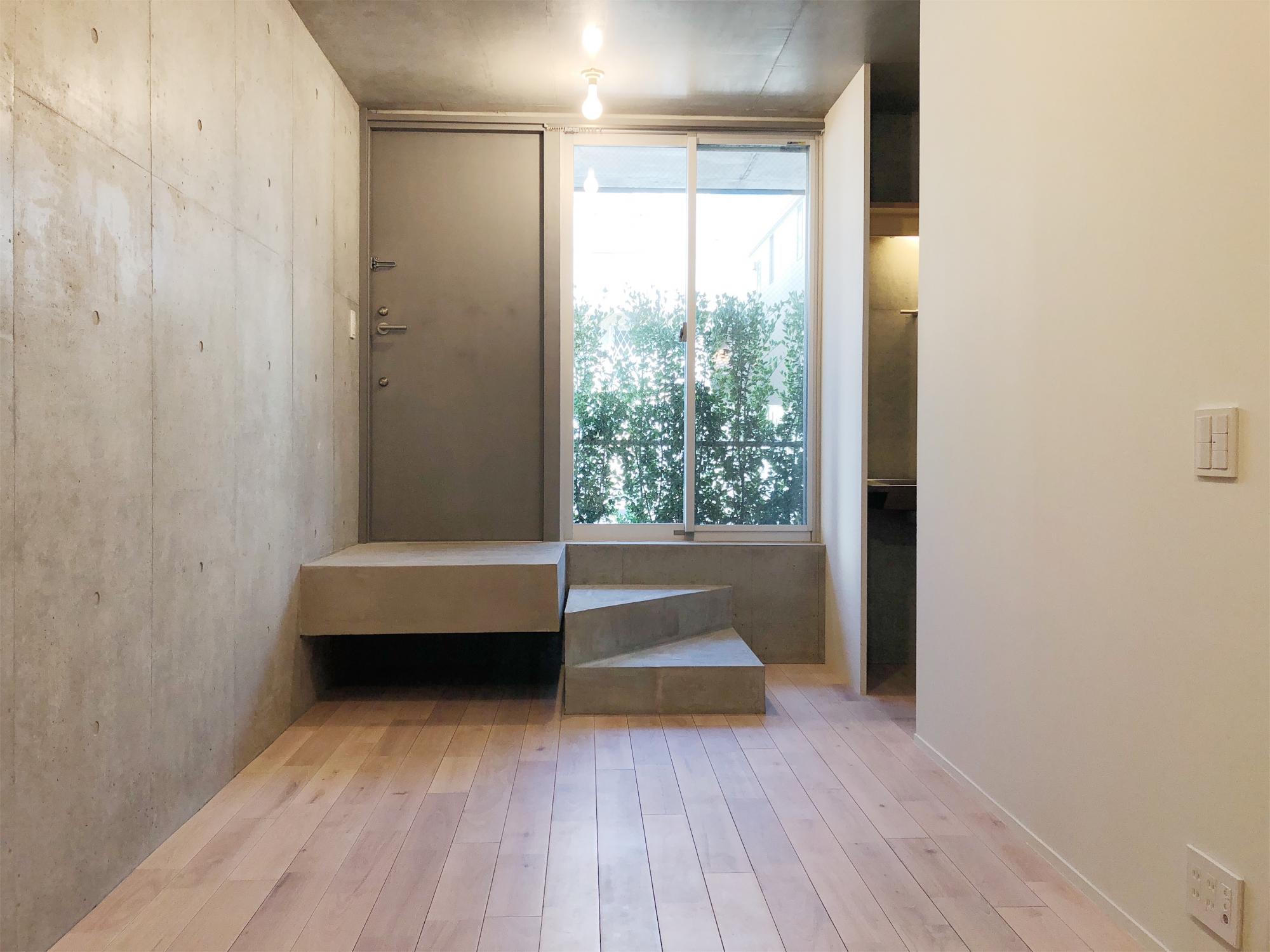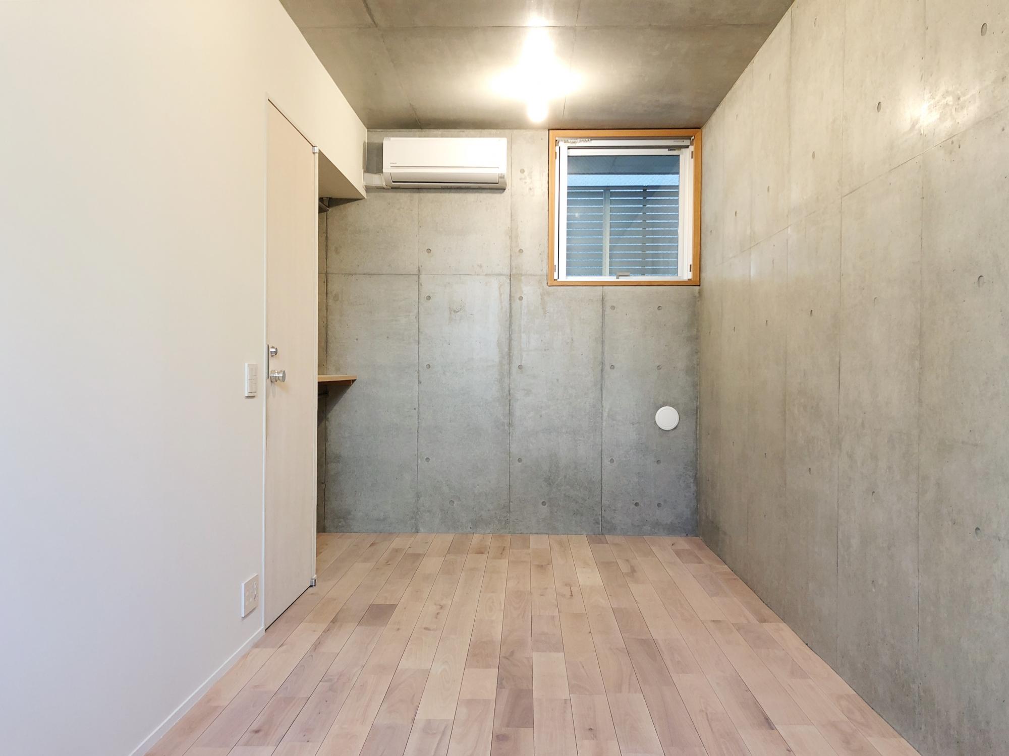 コンクリートの打ちっ放し壁のクールな印象に、桜の無垢床が凄くマッチしています。