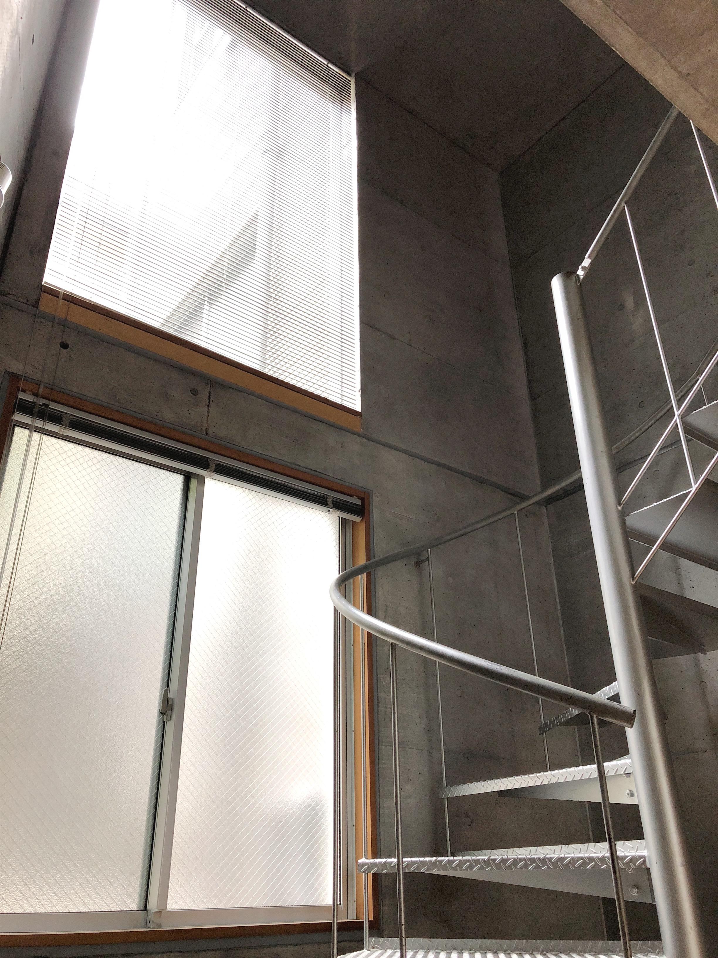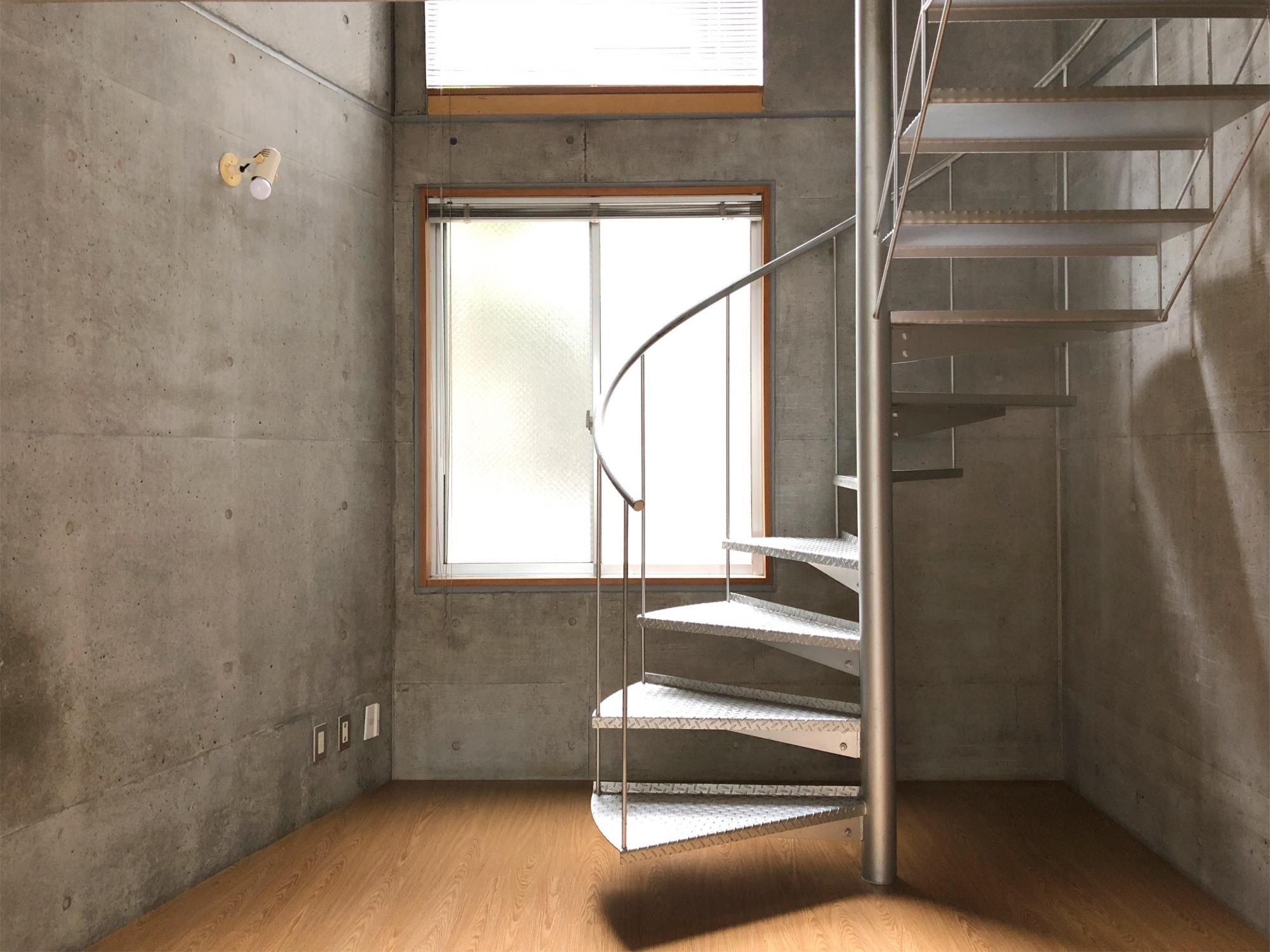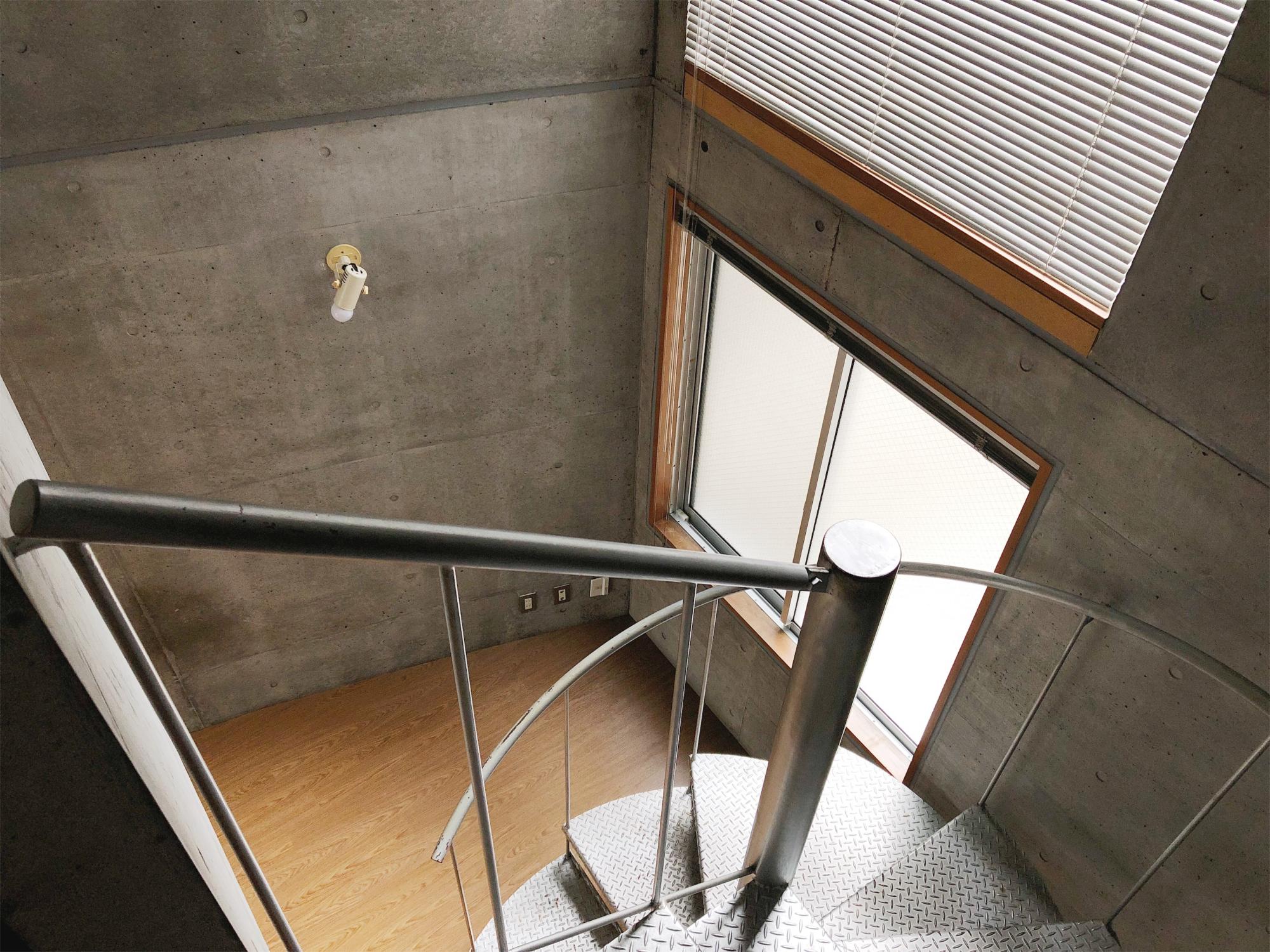 その先のらせん階段と吹き抜けに連動して、気持ちいい広がりのある空間です。