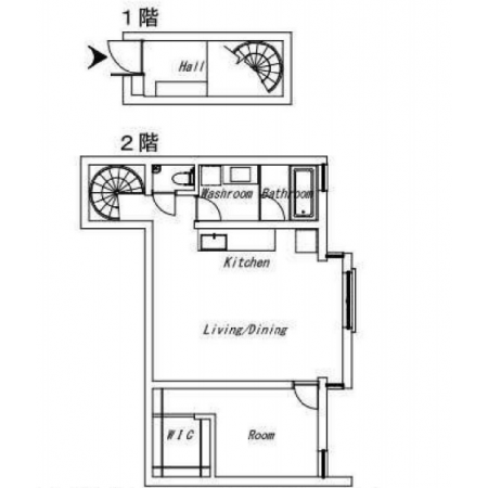2号室は、玄関入ってすぐ螺旋階段が出迎えます。