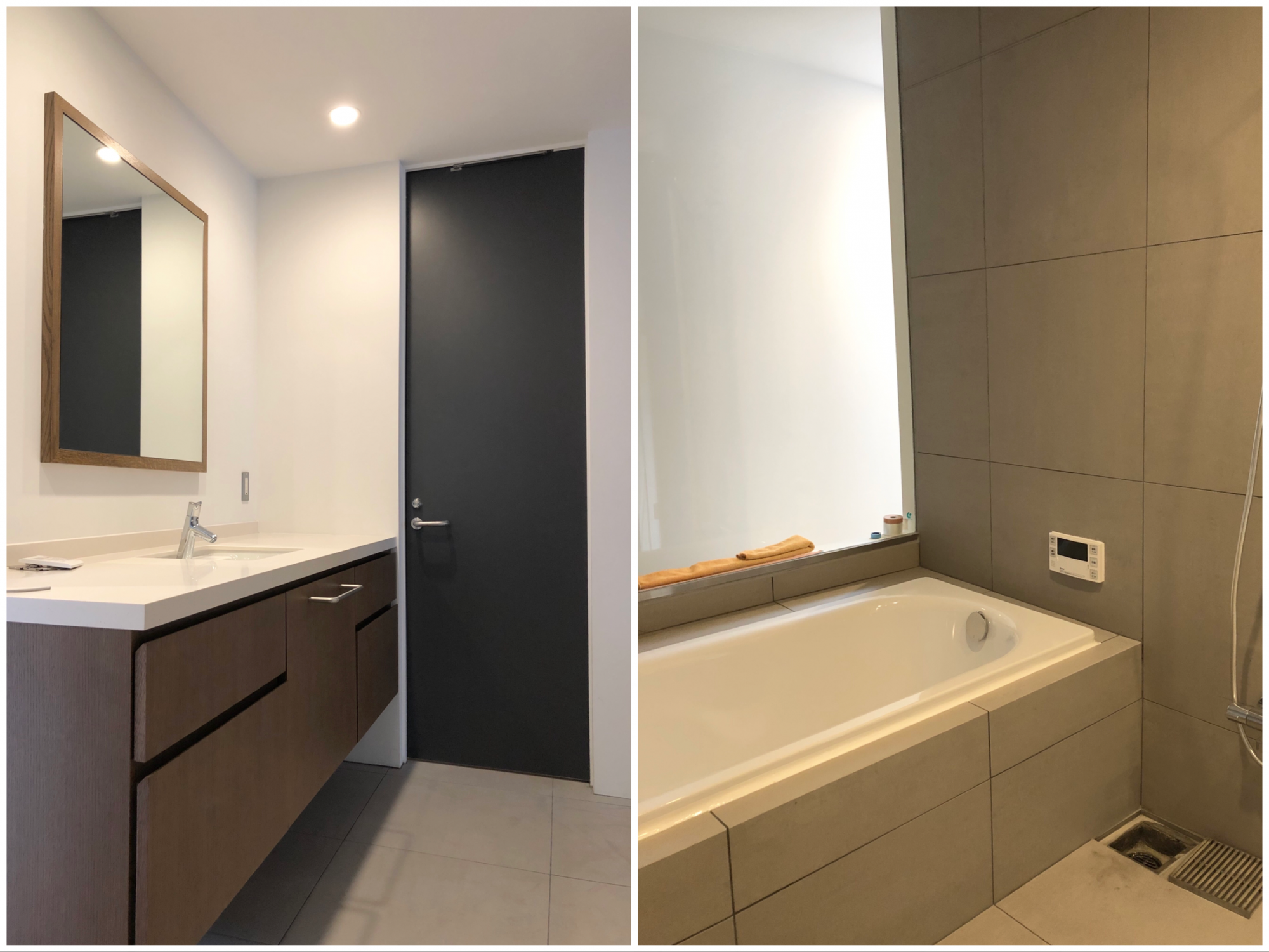 洗面所へ繋がる扉を開けると、トイレ、洗面所が置かれたスペースに、スケルトンなお風呂。