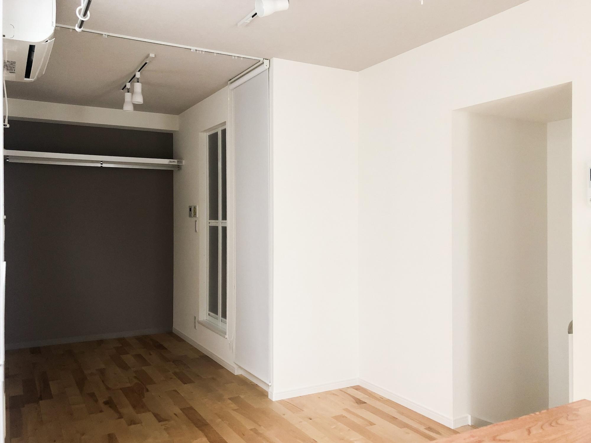 天井のグレーのアクセントカラー、お部屋の奥のブラウンのアクセントカラーが落ち着いたお部屋の雰囲気に。