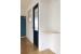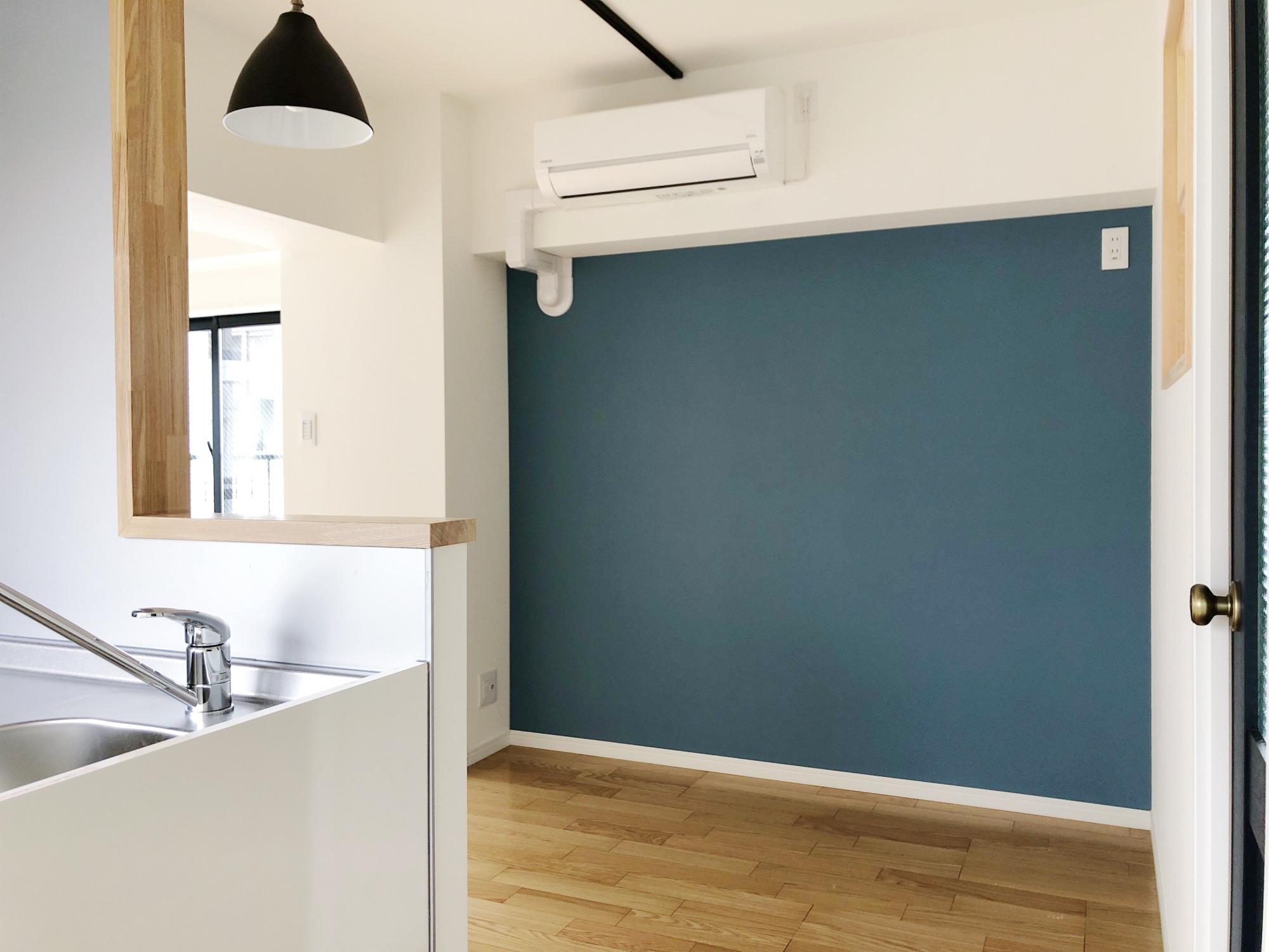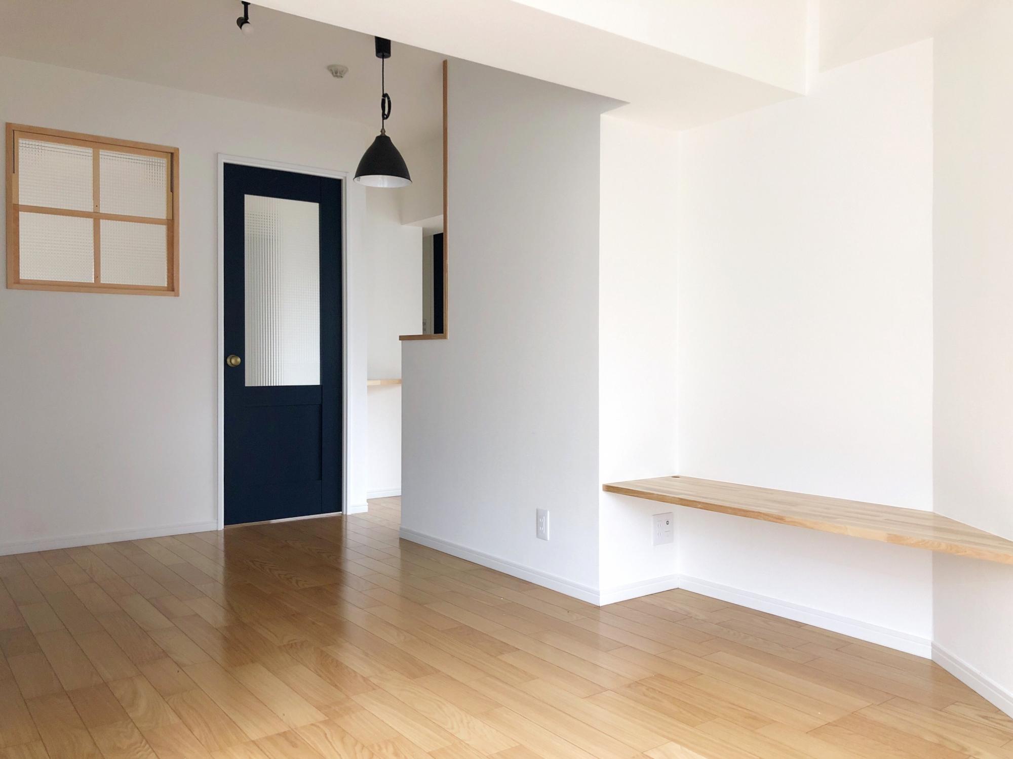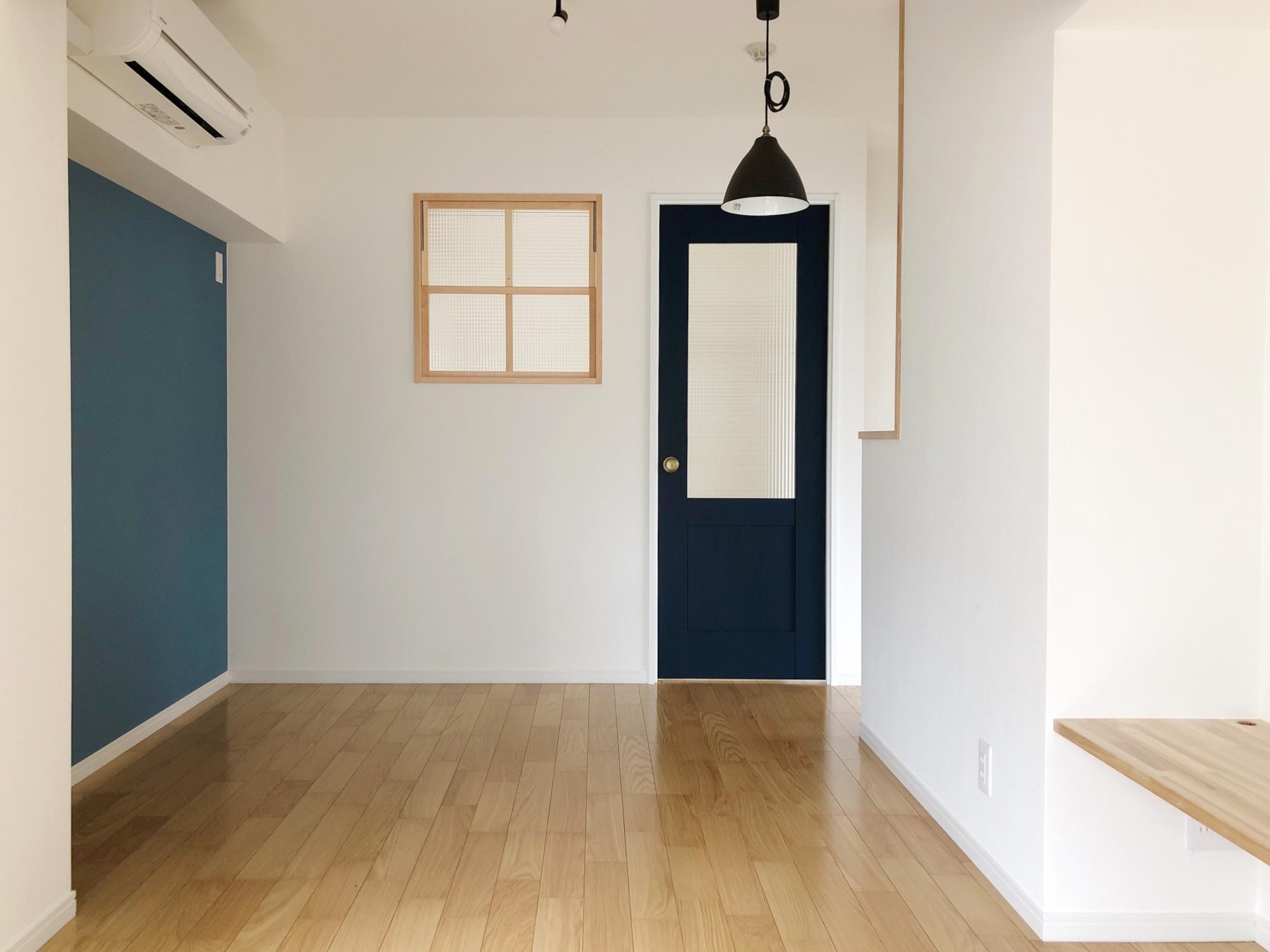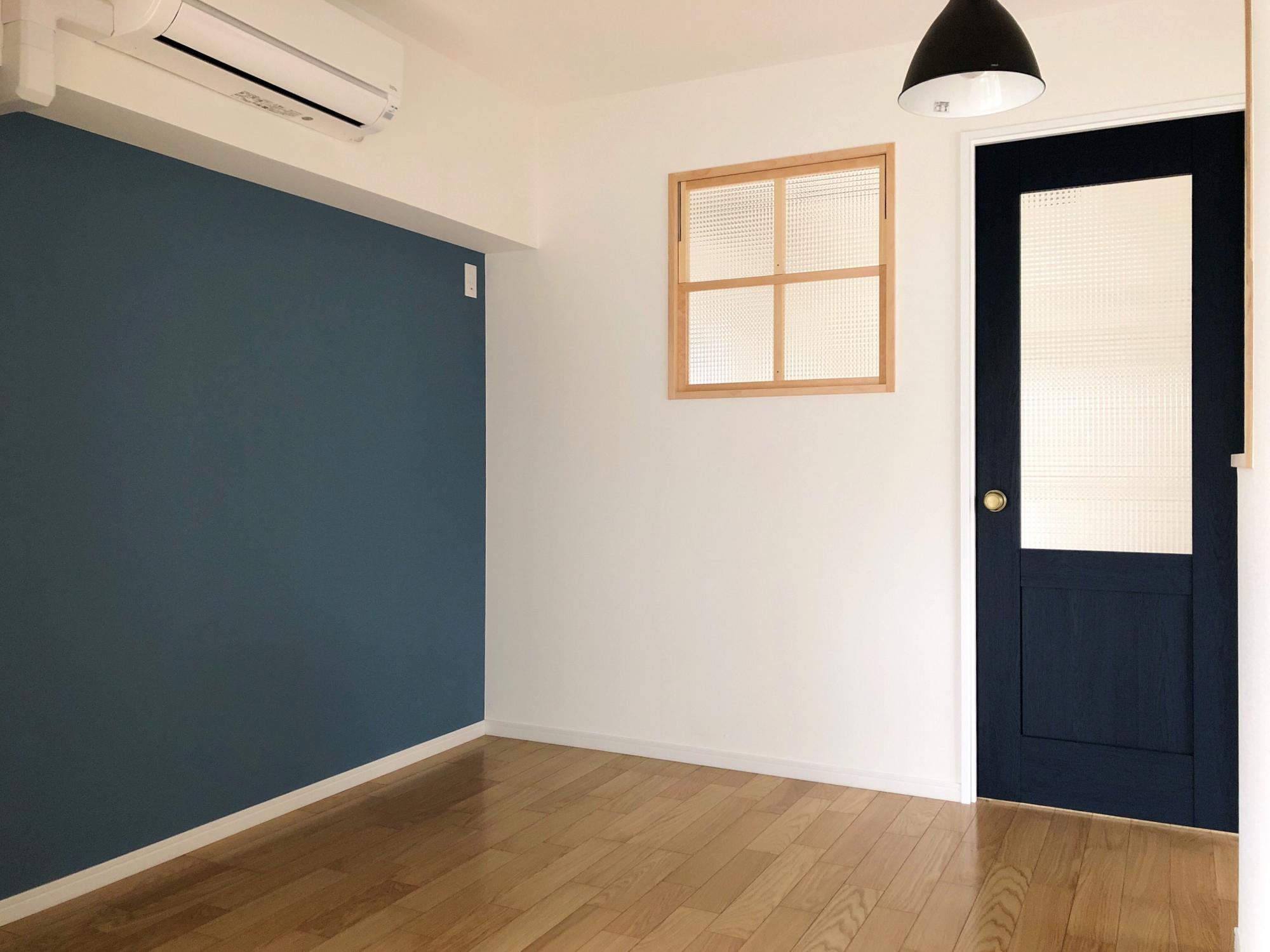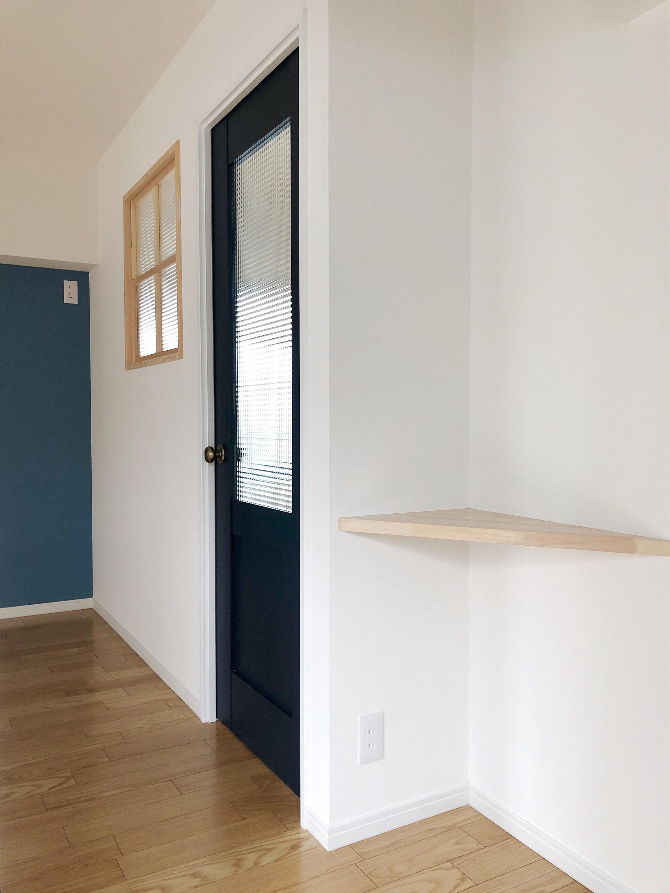 木枠の小窓に、金のドアノブ×磨りガラスがかわいい紺のドア、
