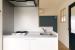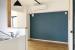 ブルーのクロス、ライティングレールに吊るされた照明。
