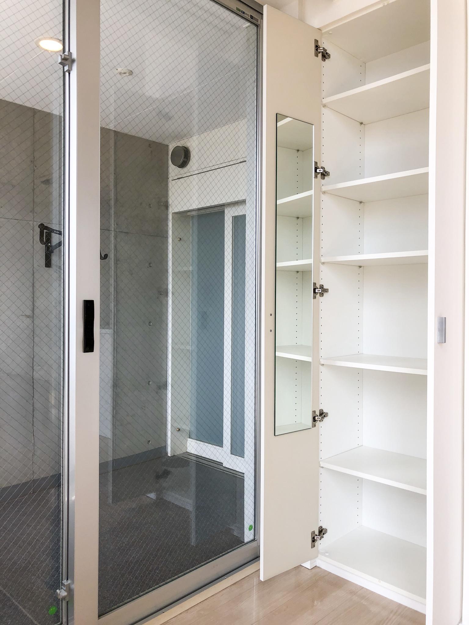 玄関の扉を入ると、壁面ディスプレイラック付きのゆったりとした専用駐輪スペース。