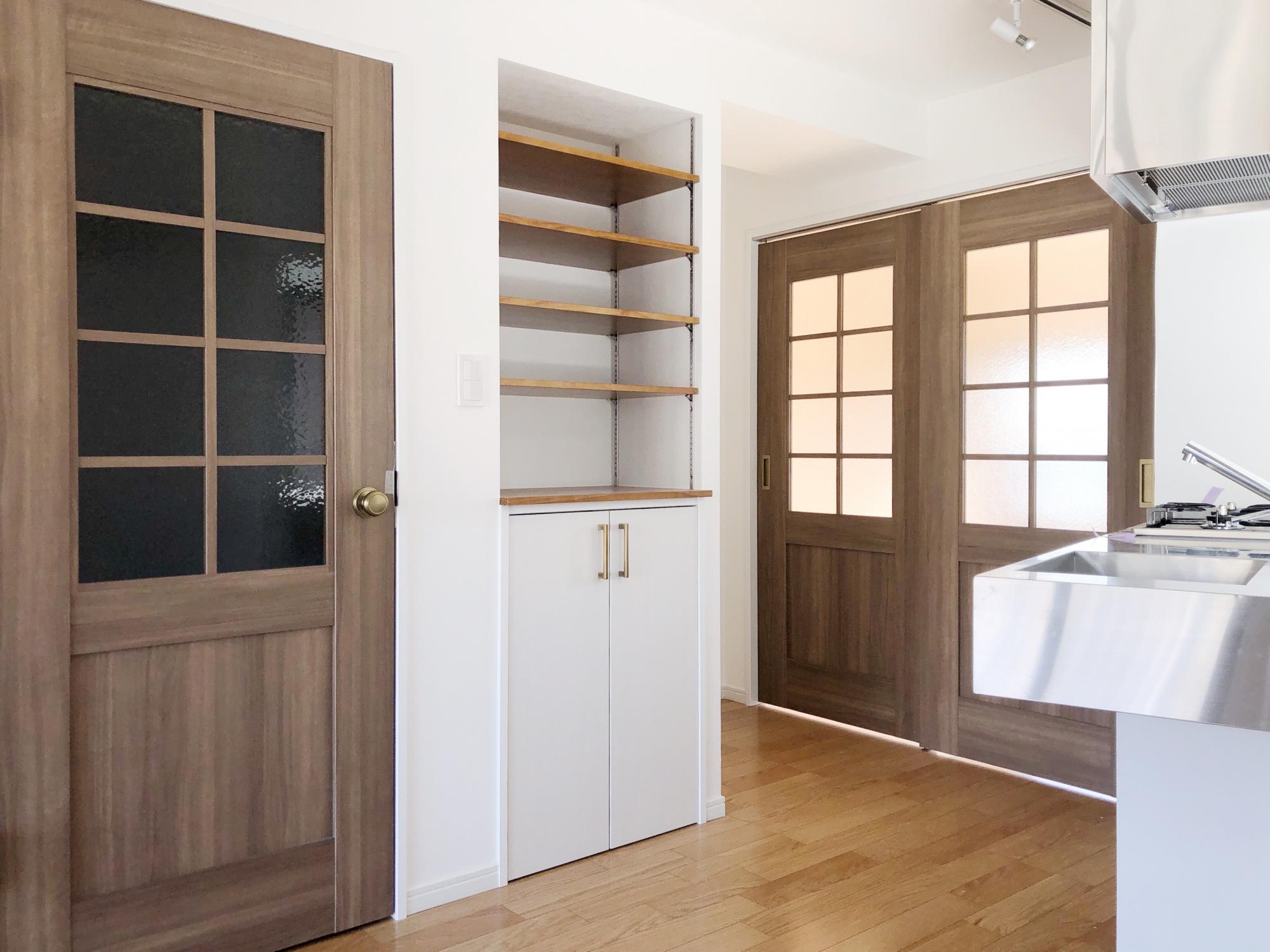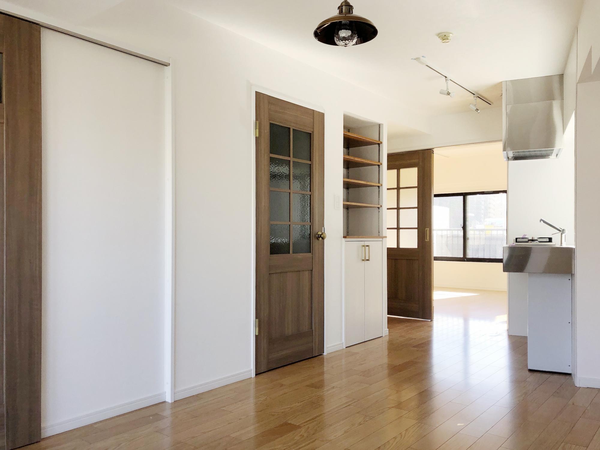 玄関を開けてリビング入り口の北欧風の木の建具がもうかわいい。