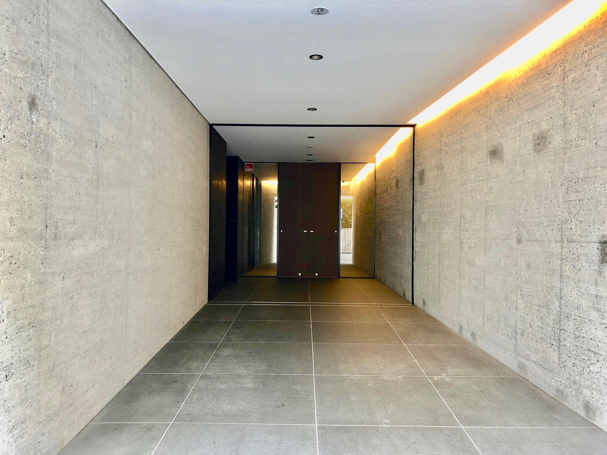 坂の途中のコンクリート枠の開口部に入ると建物エントランス。