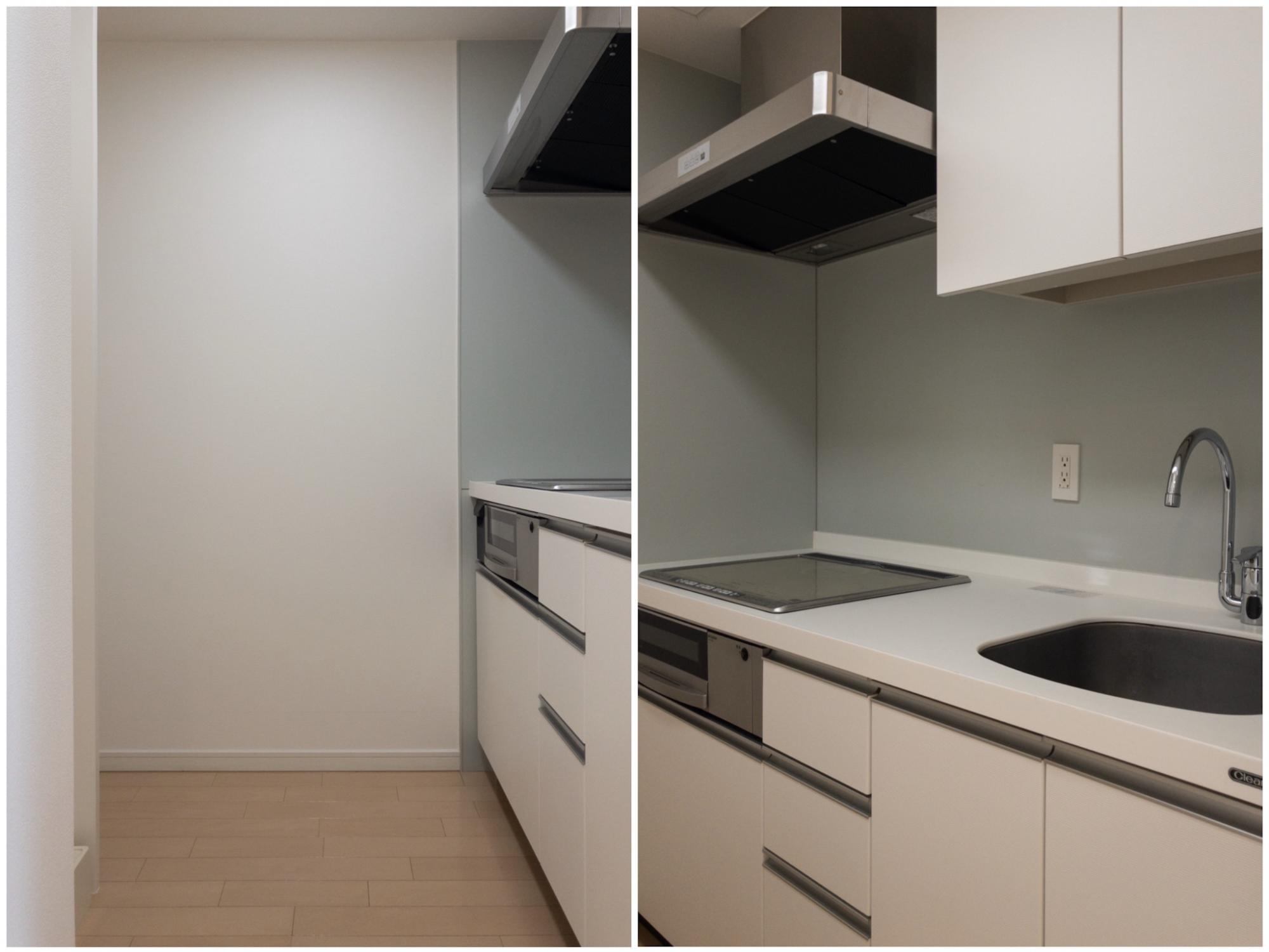 広いキッチン、エアコンが天井ビルトインというのがまた良い。