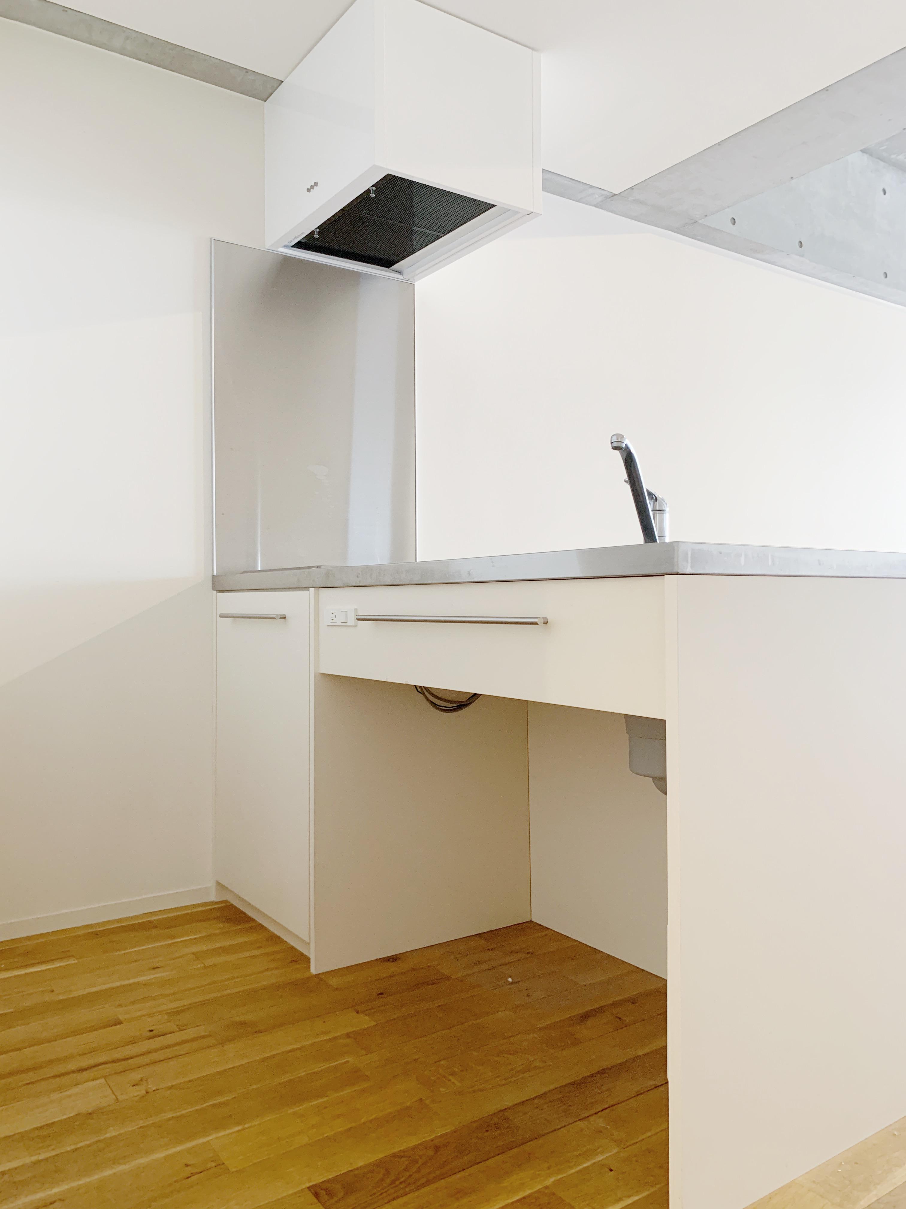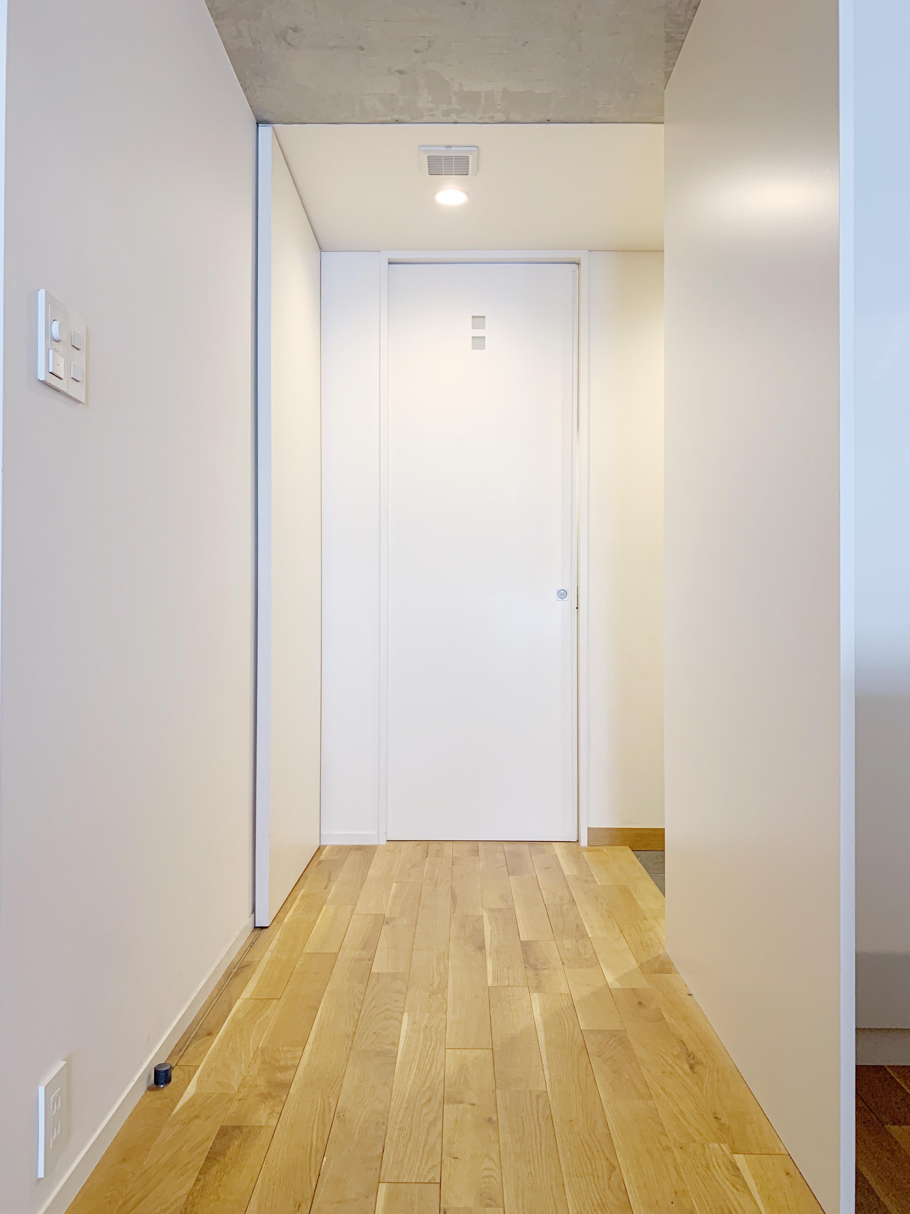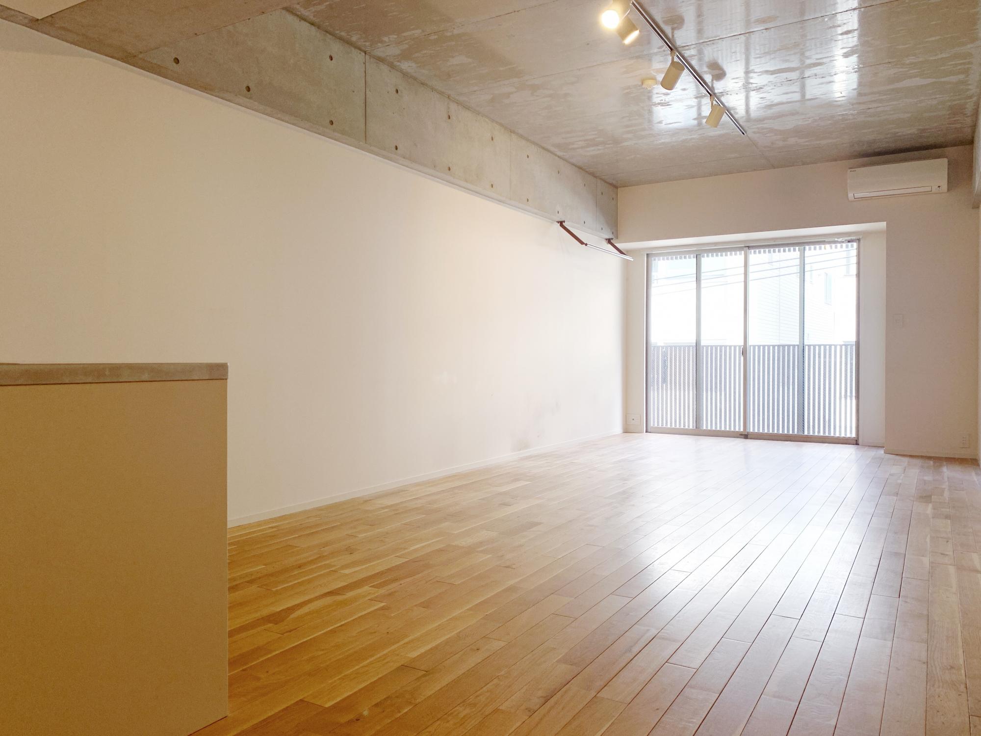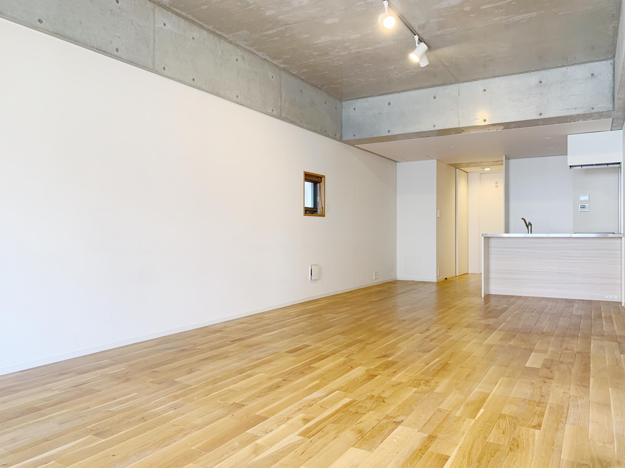 天井は、コンクリート打放し、壁は、白の塗装、あたたかみのある無垢床。