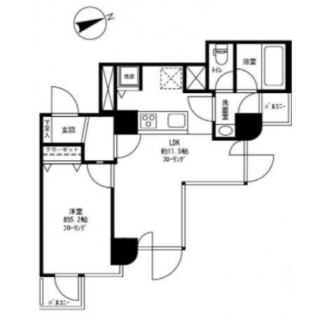 お部屋は、約11.5帖のLDKと、約5.2帖の洋室で構成された、1LDK間取り。