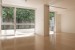 大きな窓一面から光が射して明るい空間に、グリーンの背景。