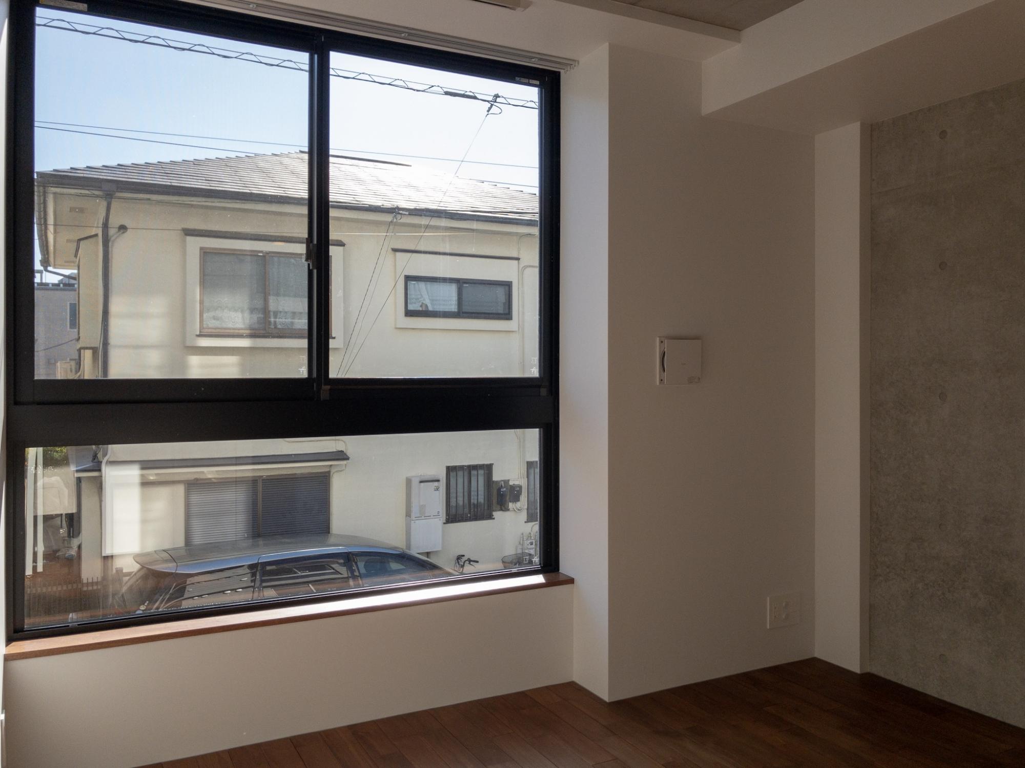 シンプルなお部屋に彩りを添えるのは、大きな窓から見える空の青。