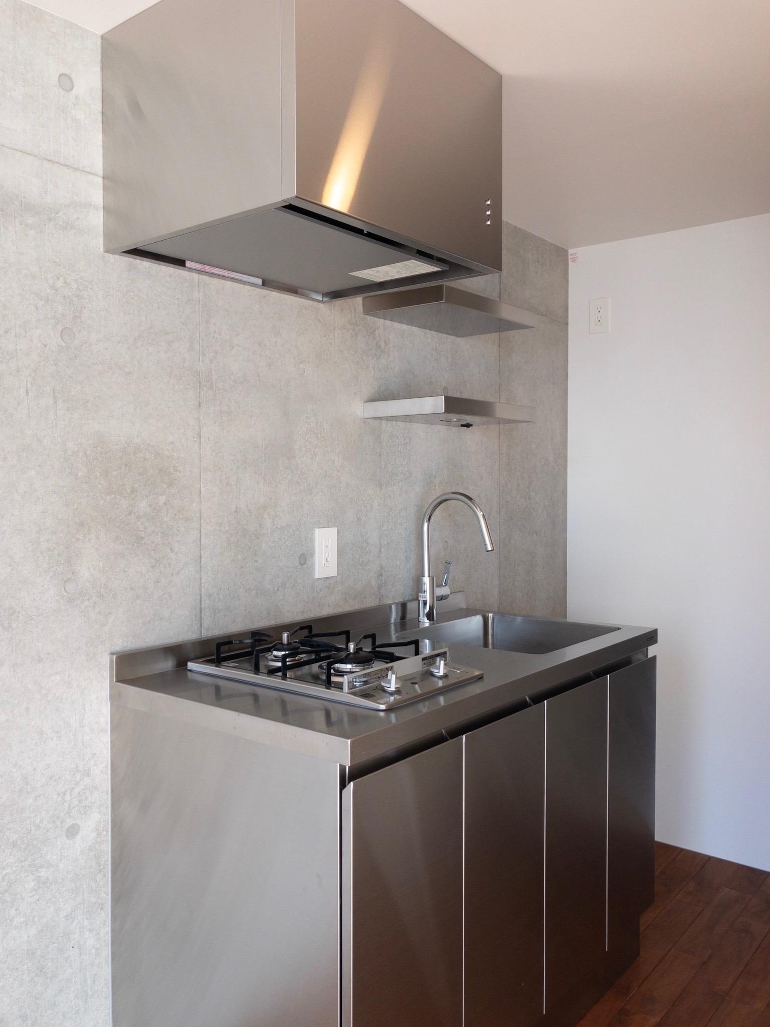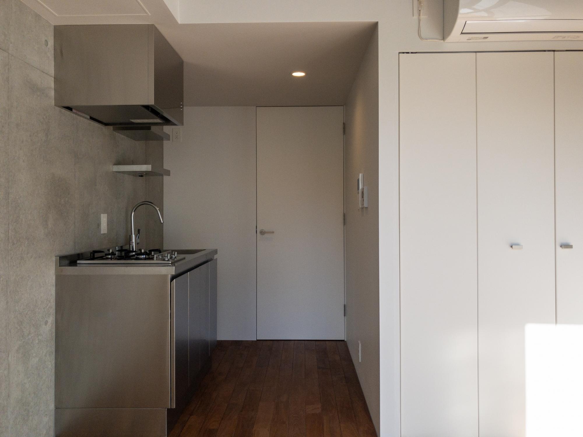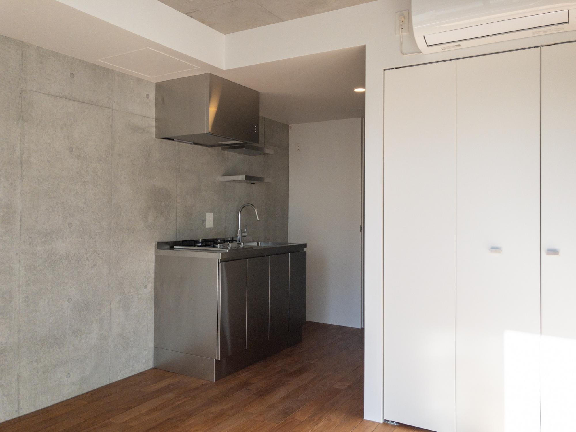 打ちっ放しコンクリートと白い壁、ダークブラウンの床、ステンレスキッチン。