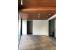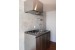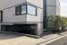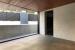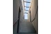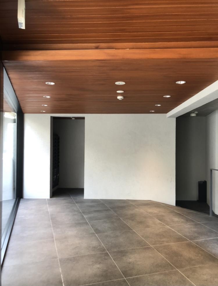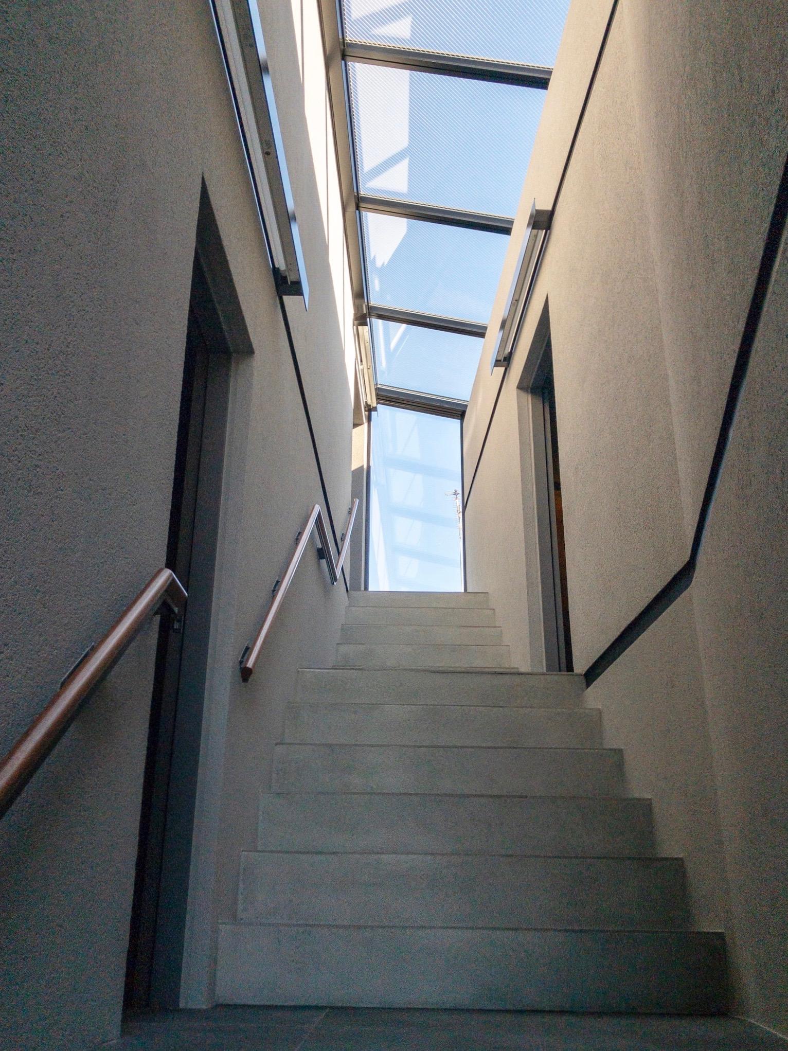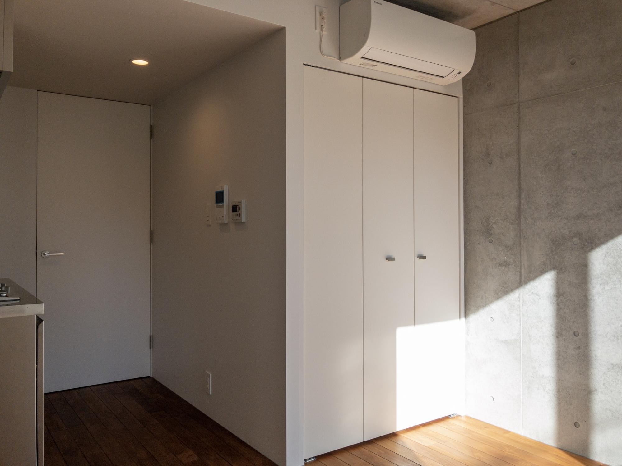 打ちっ放しコンクリートと白い壁、ダークブラウンの床、ステンレスキッチン。