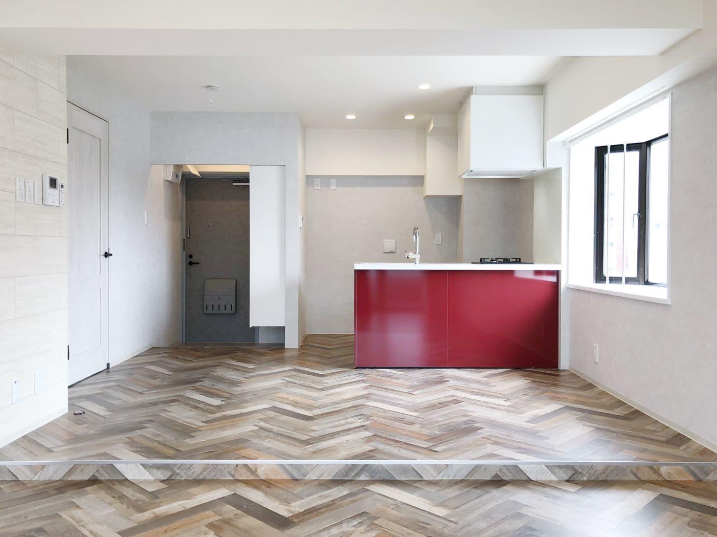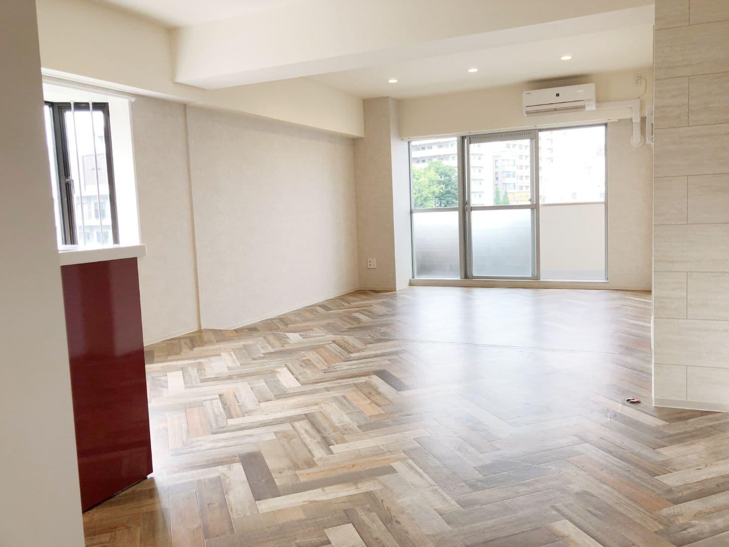 ヘリンボーン床のあるリビングは15.6帖と広々としていい!