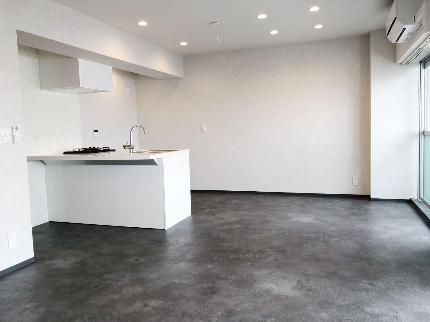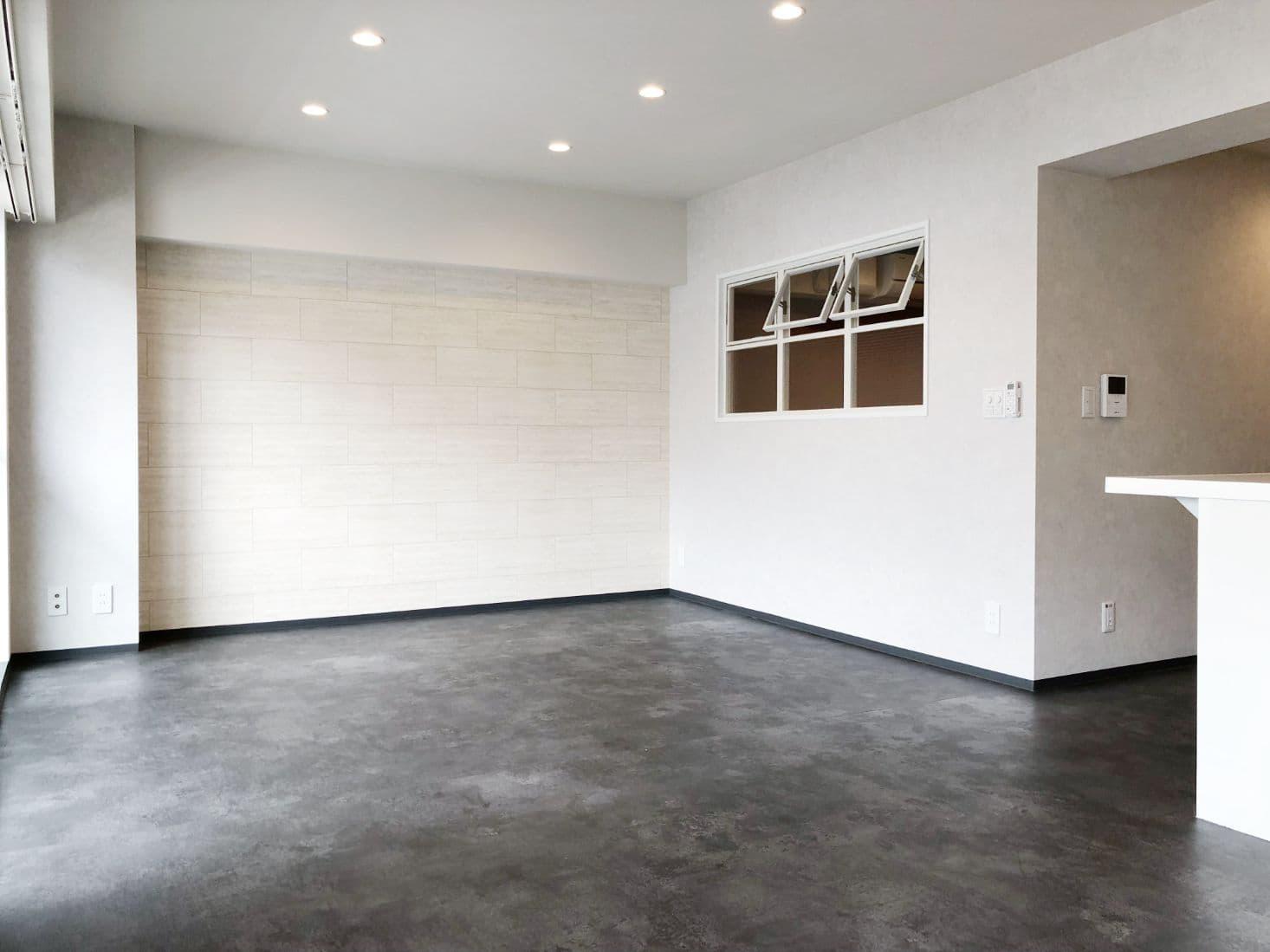 リビングはコンクリート調の床で15.1帖と広々としていい!