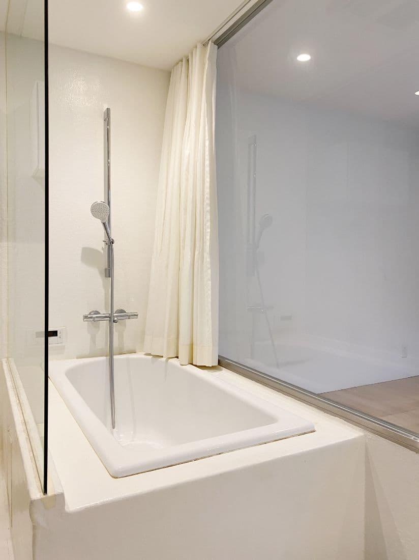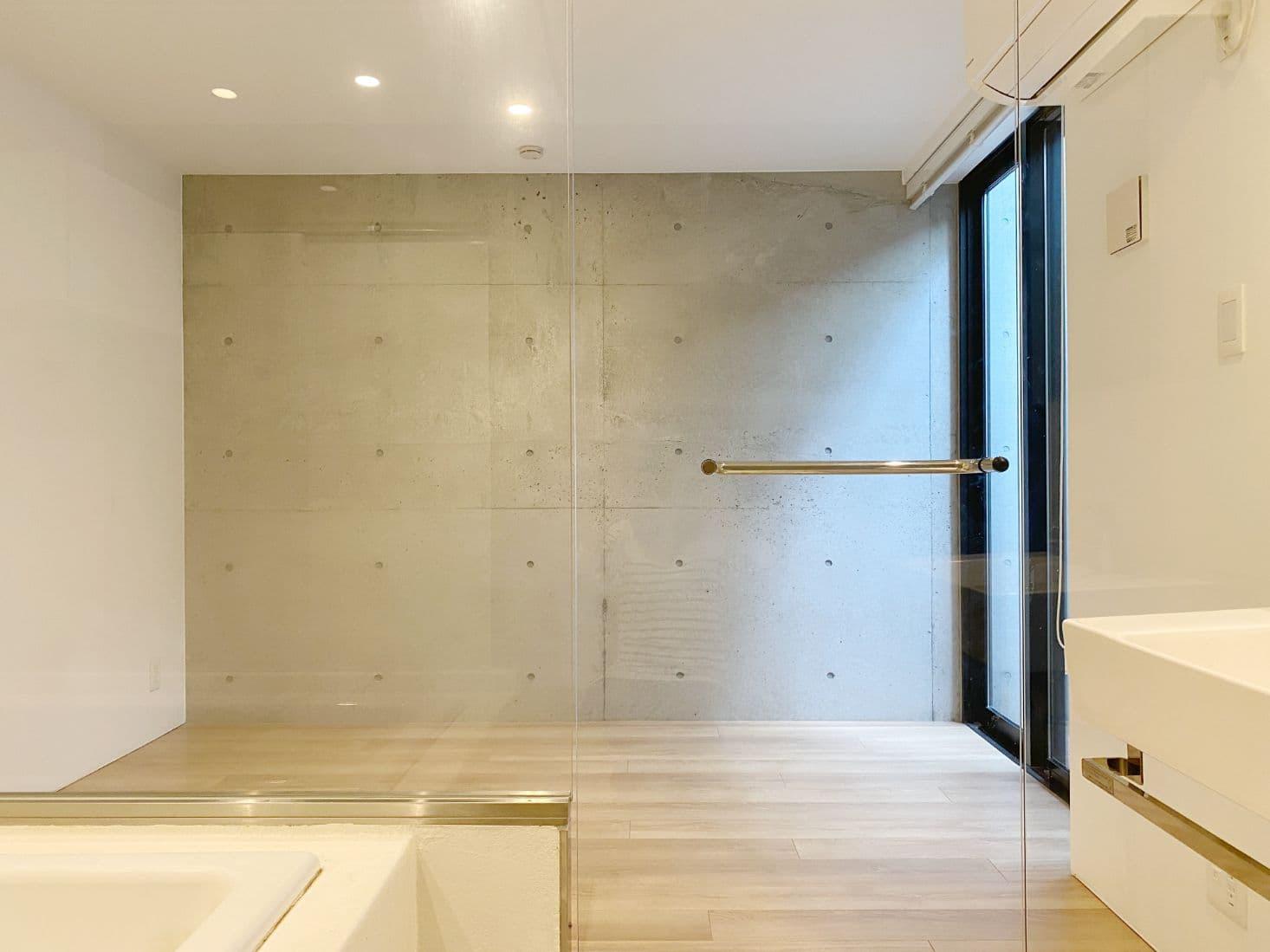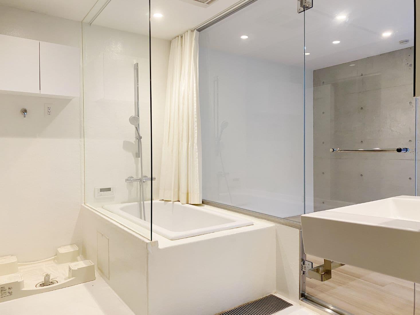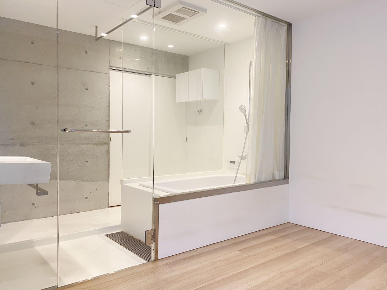 部屋の壁にプロジェクターを映してガラス越しに映画を見たり、バスルームが中心となった暮らしになりそうです。