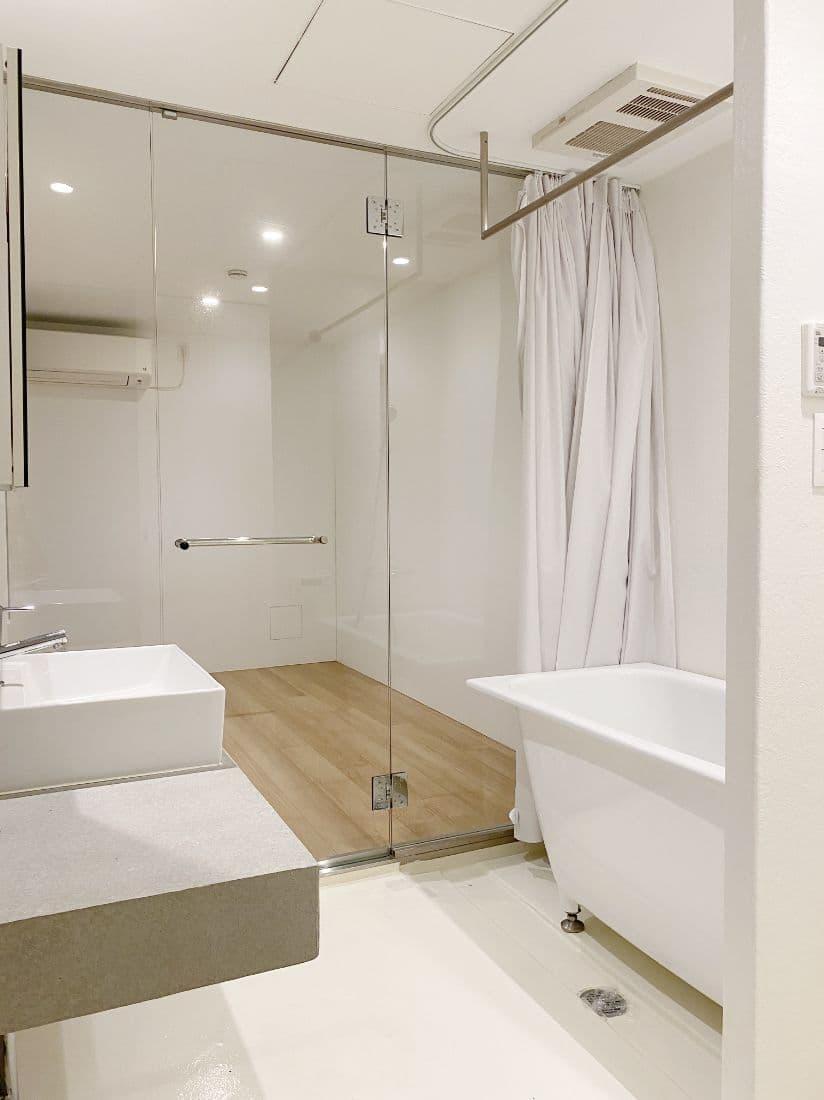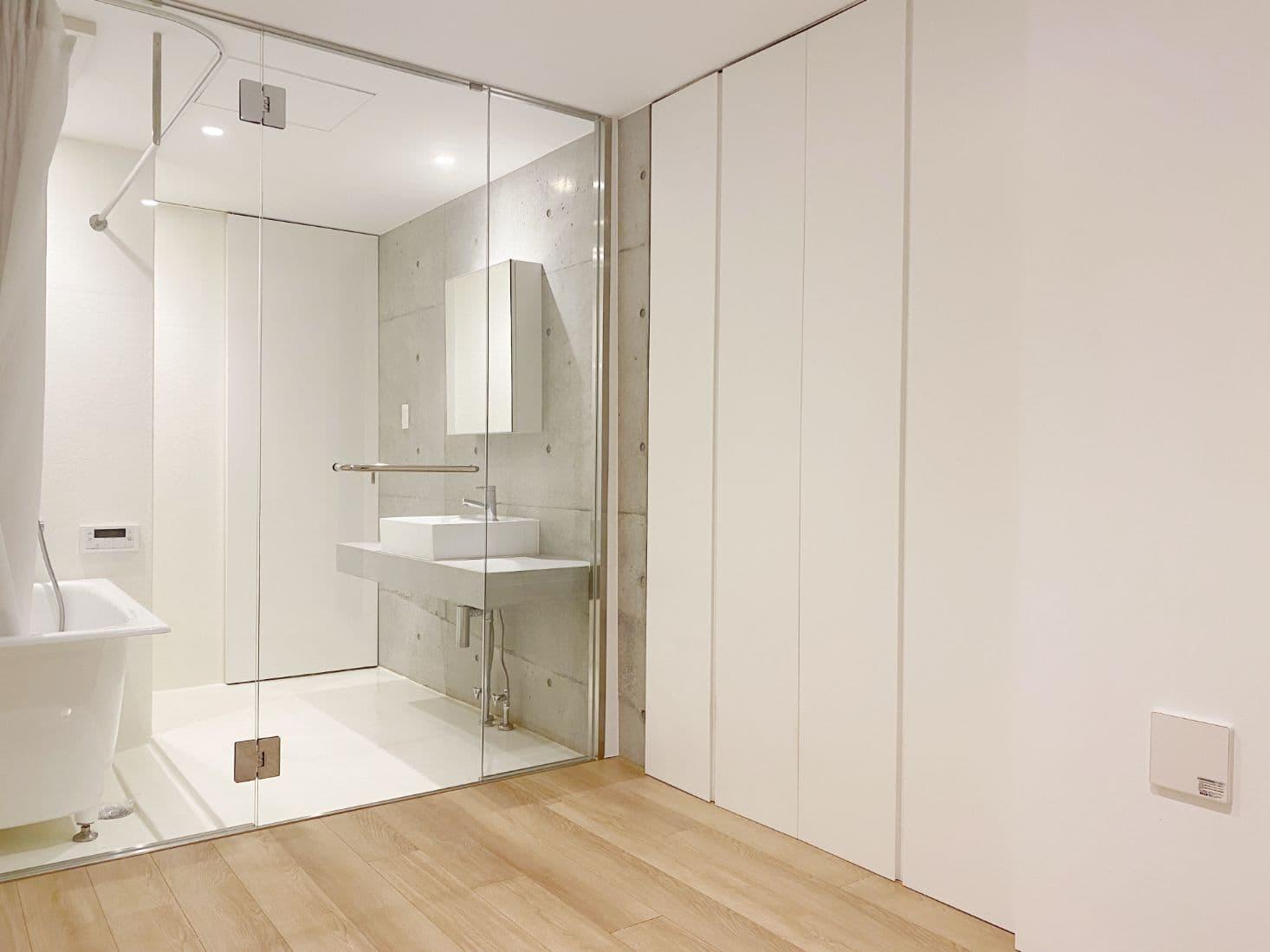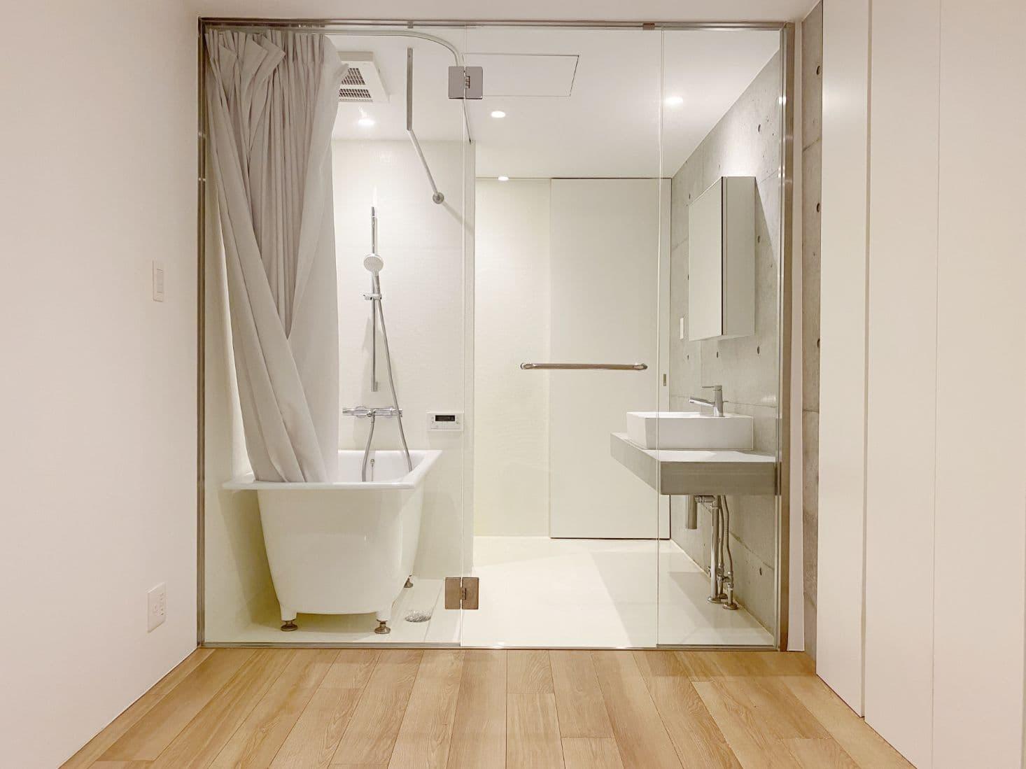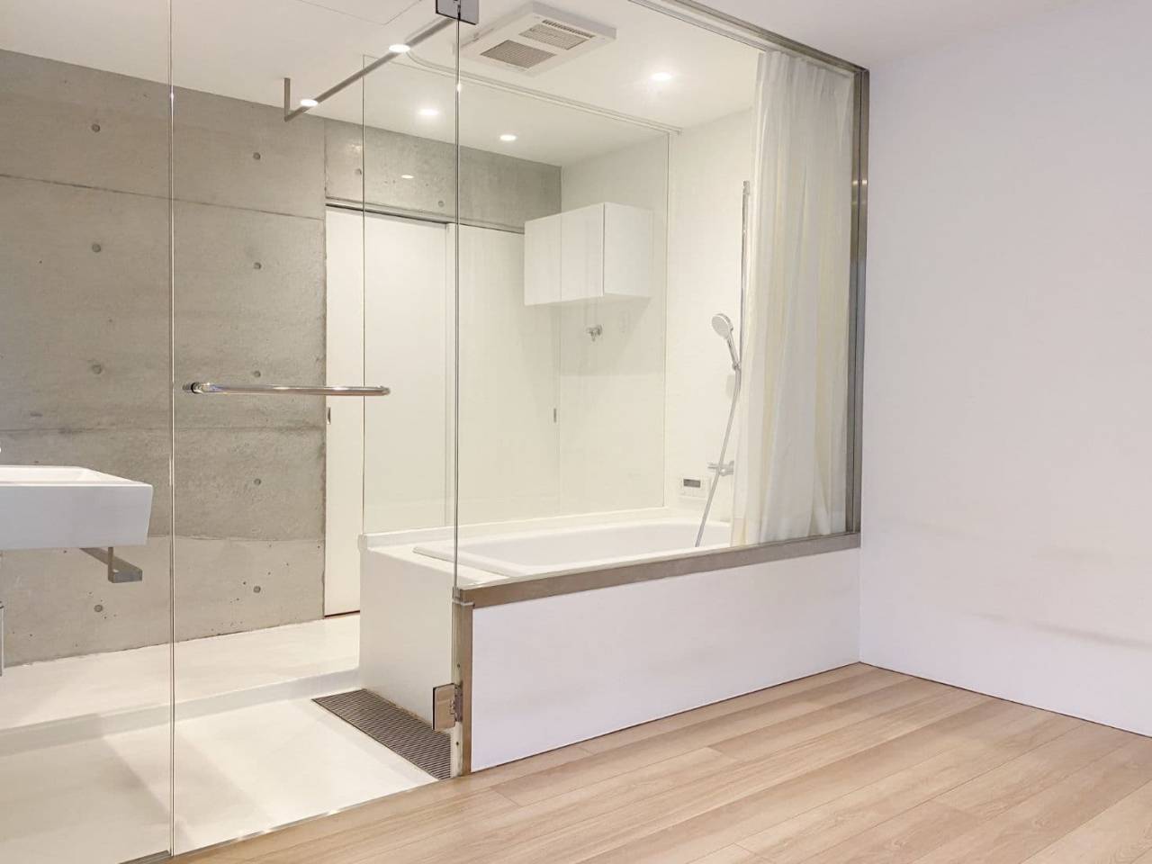 部屋の壁にプロジェクターを映してガラス越しに映画を見たり、バスルームが中心となった暮らしになりそうです。