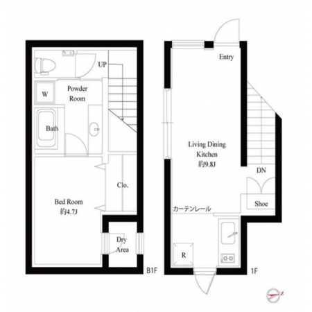 地下のバーに下りるような階段を進むと、バスルーム越しに洋室のある間取り。