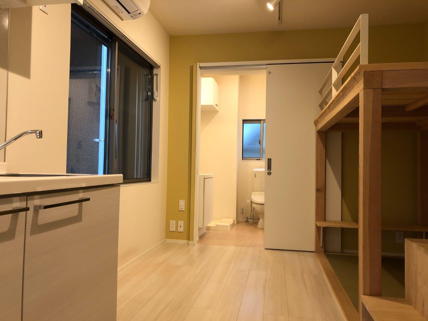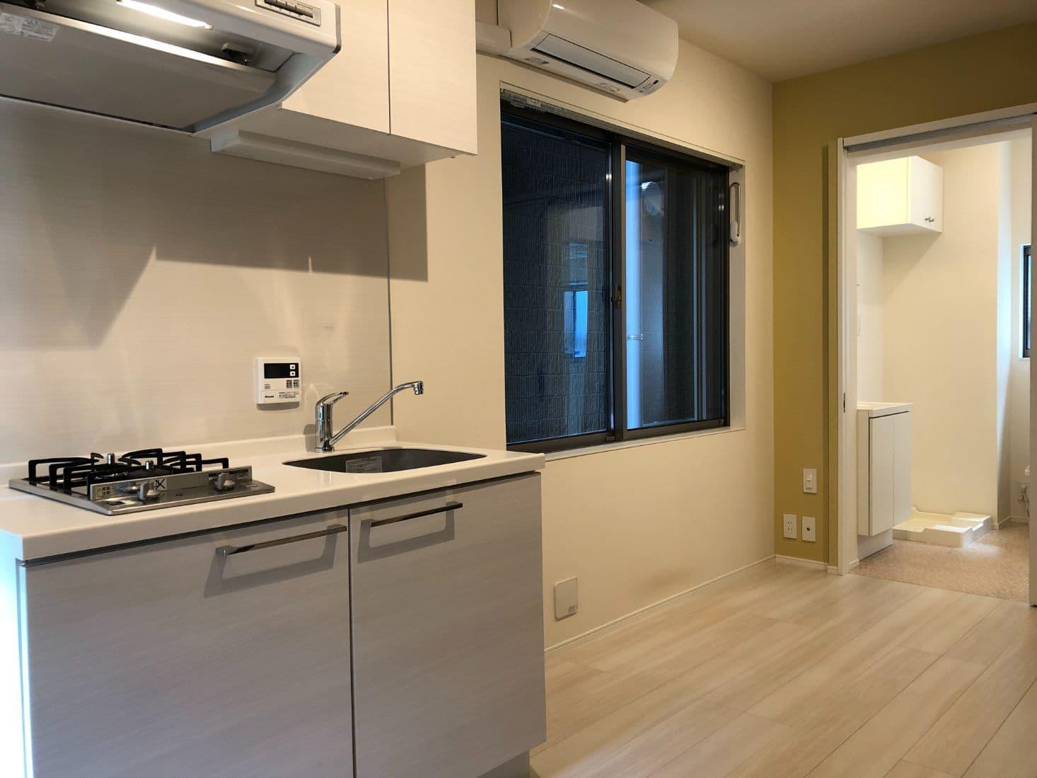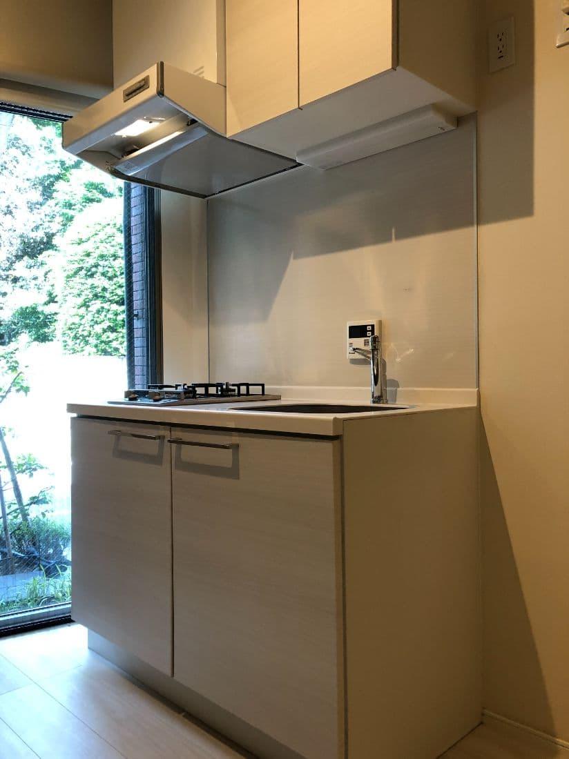 キッチンには2口コンロが設置されており、収納もばっちり。料理好きの方にも満足いただける環境が整っています。