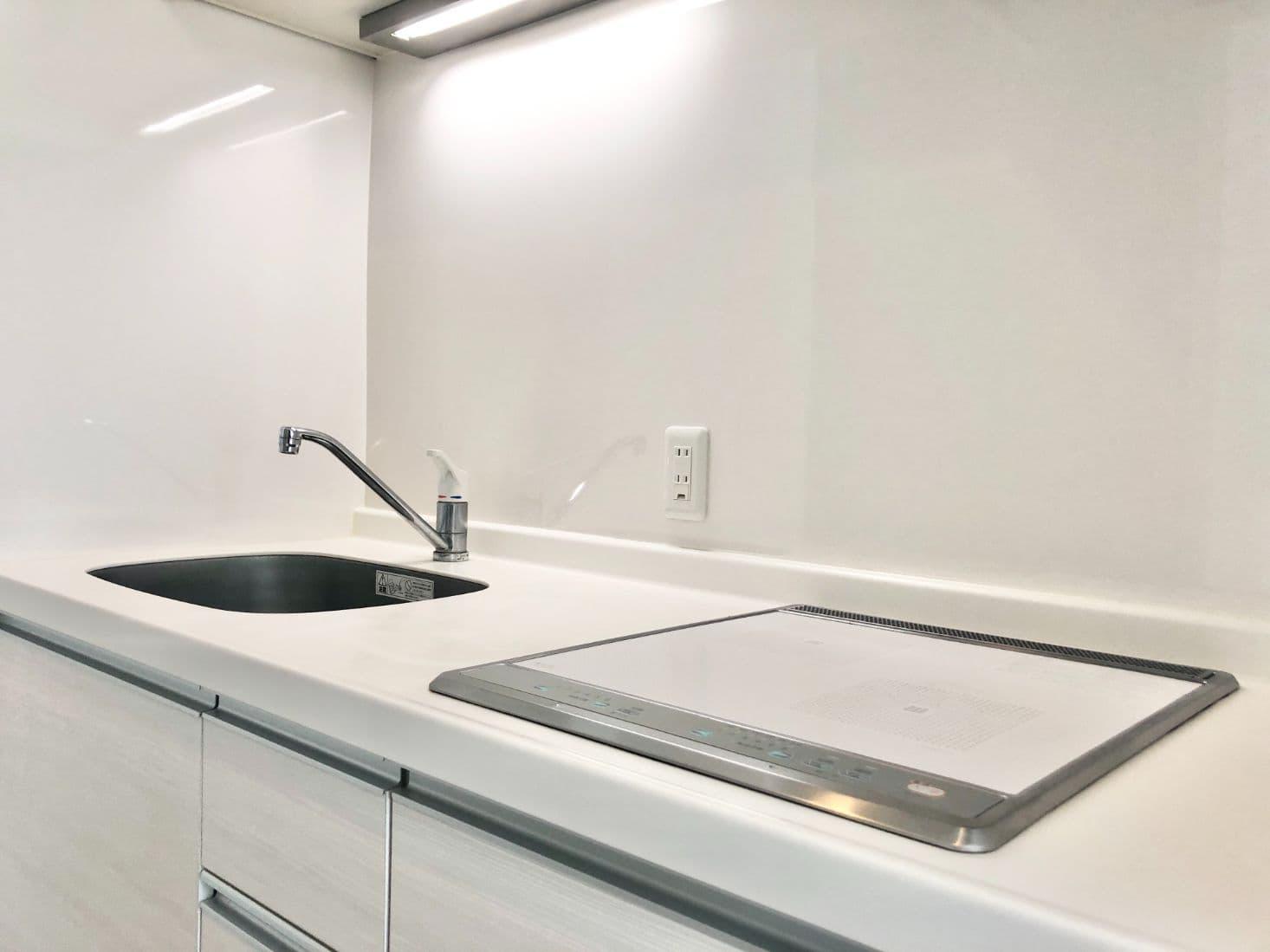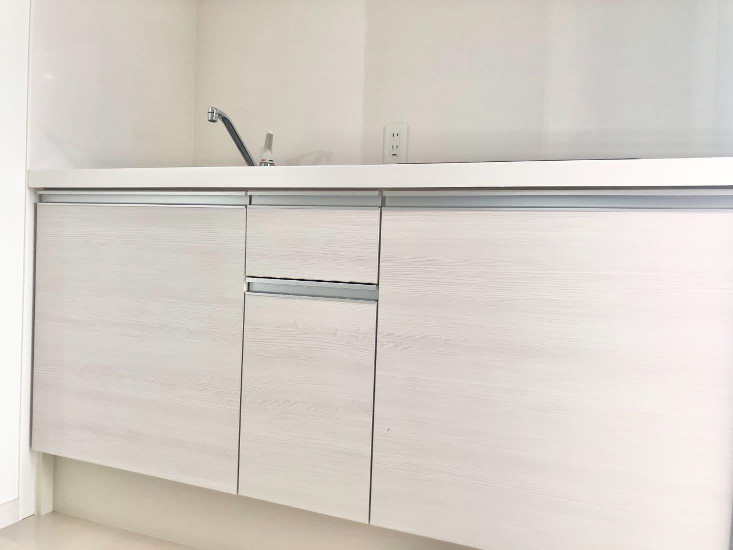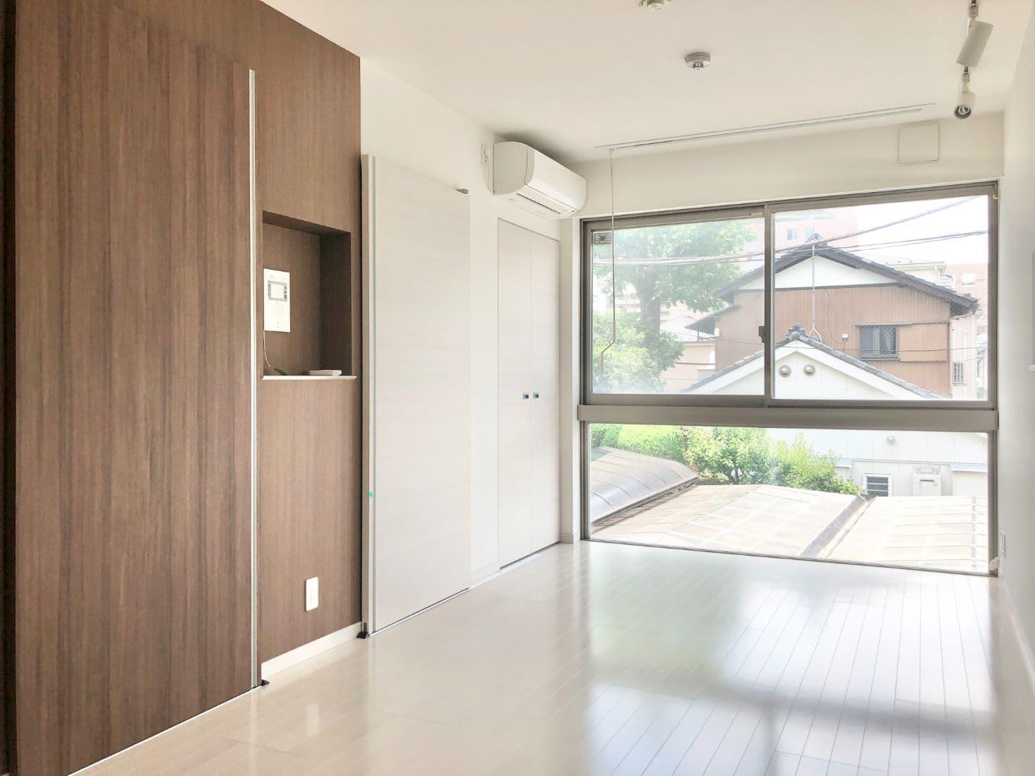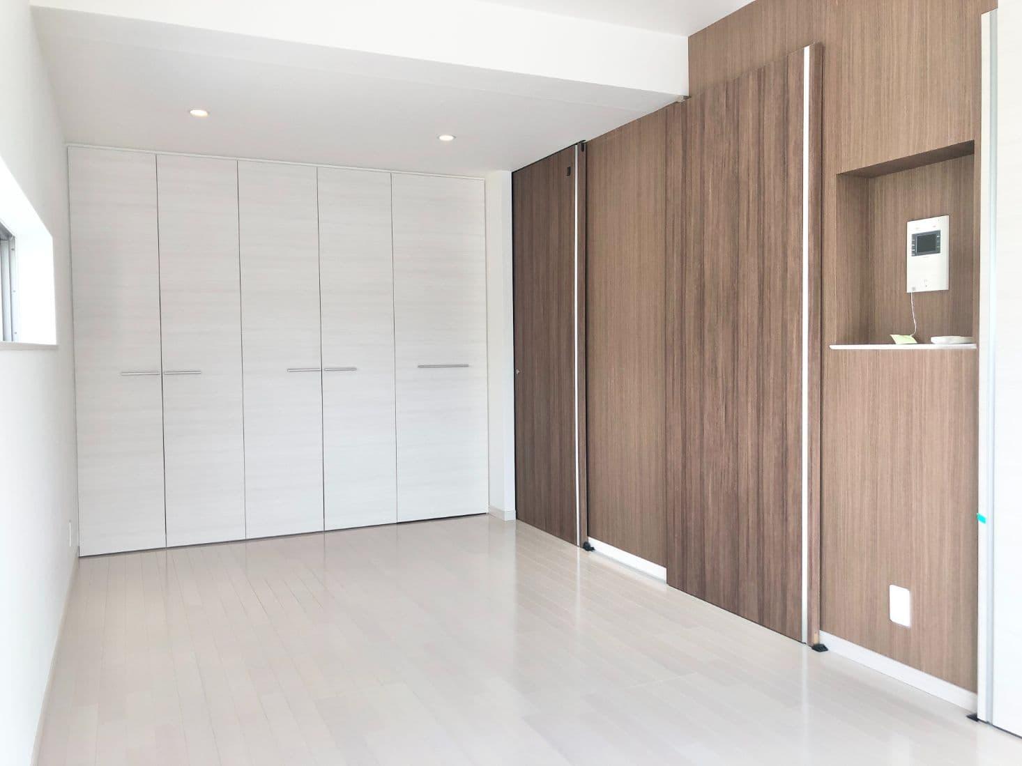 お部屋は1Kタイプのホワイトとブラウンの組み合わせが印象的な内装です。