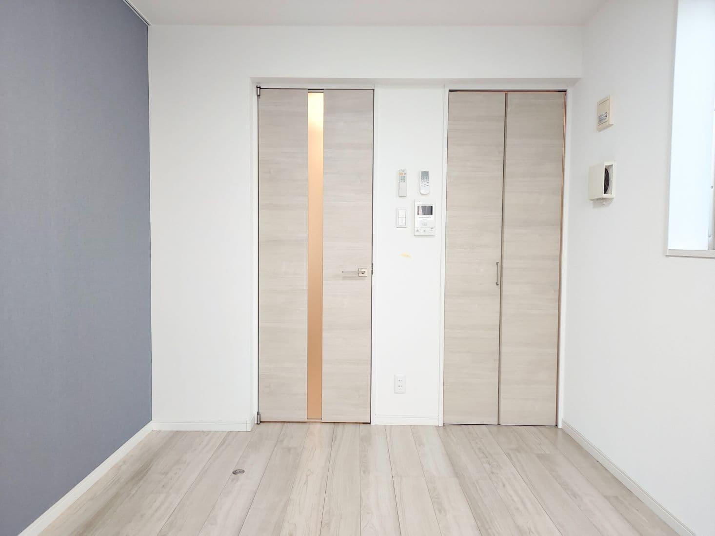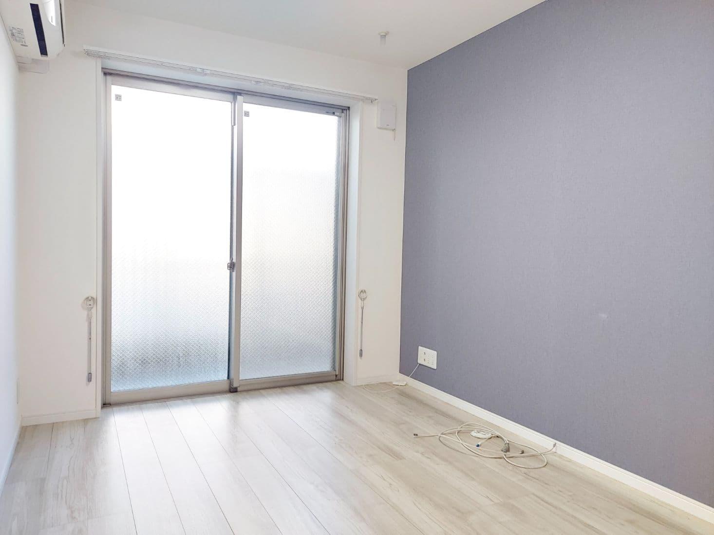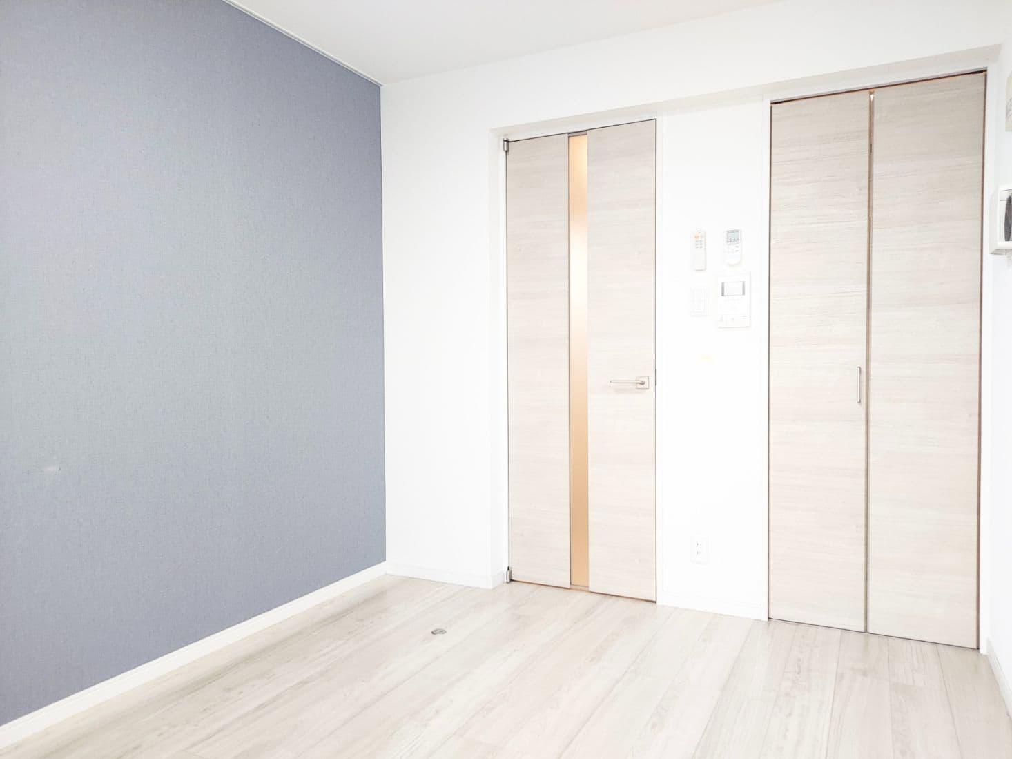 青色の壁がアクセントの明るい1K