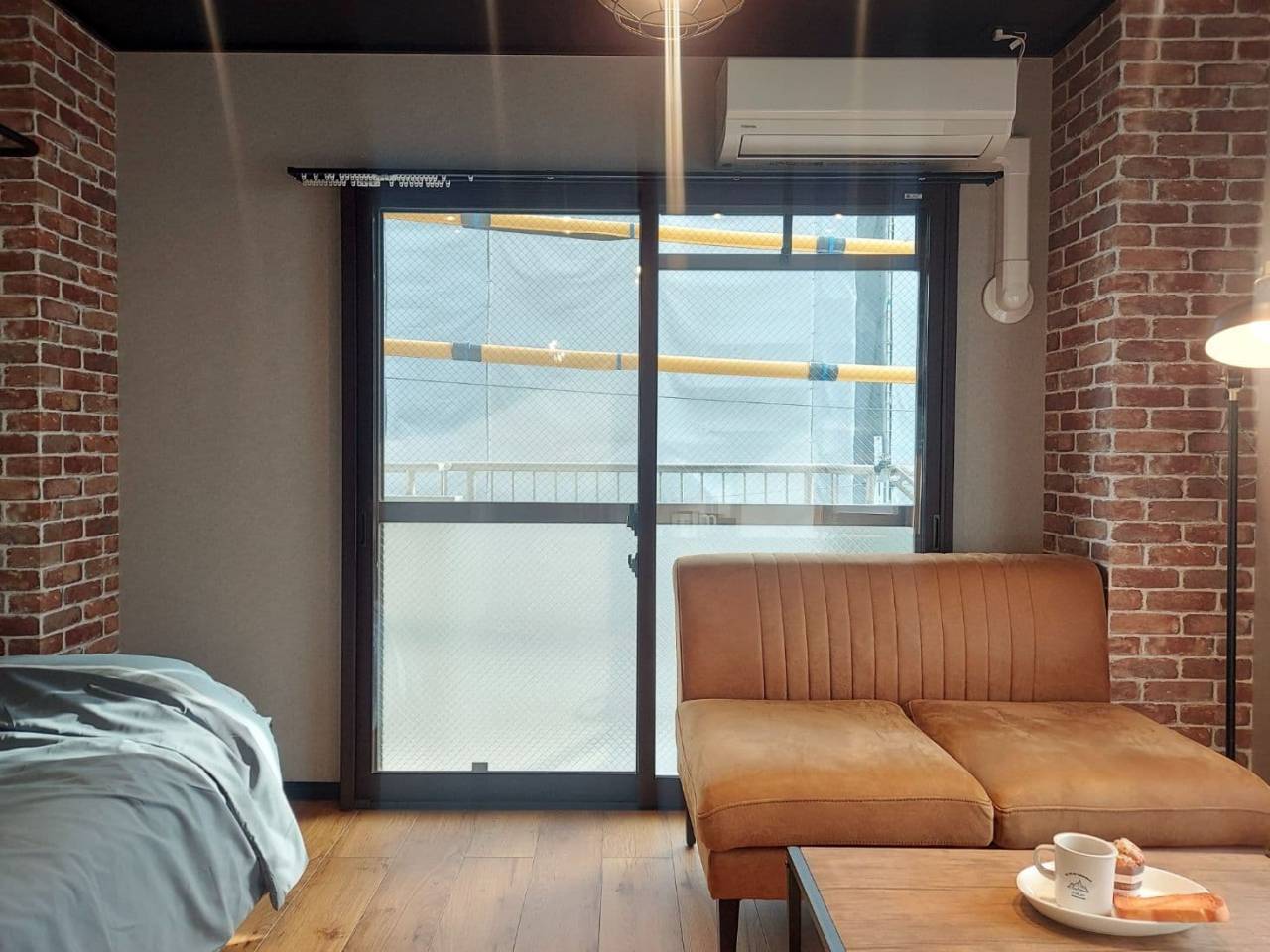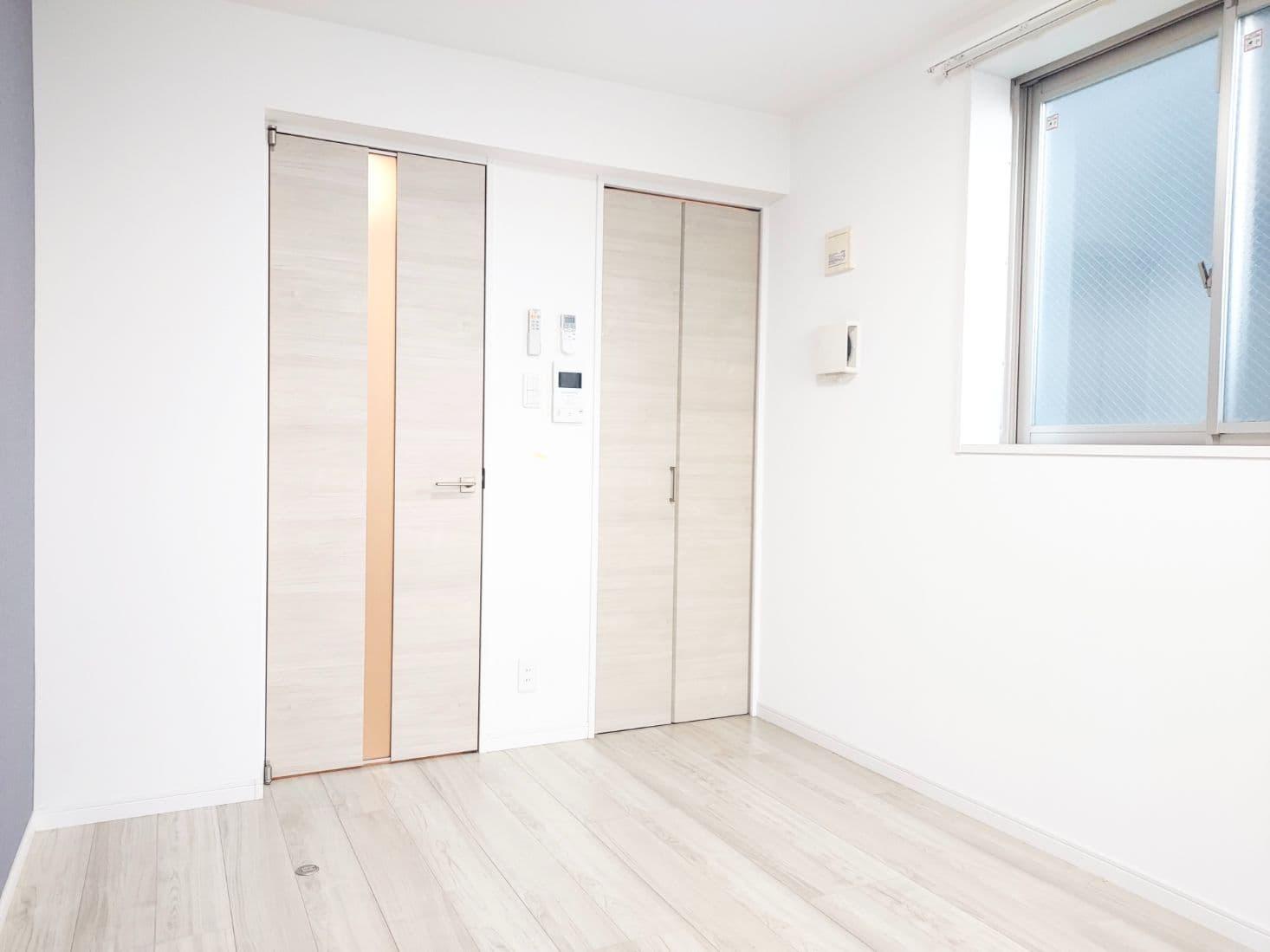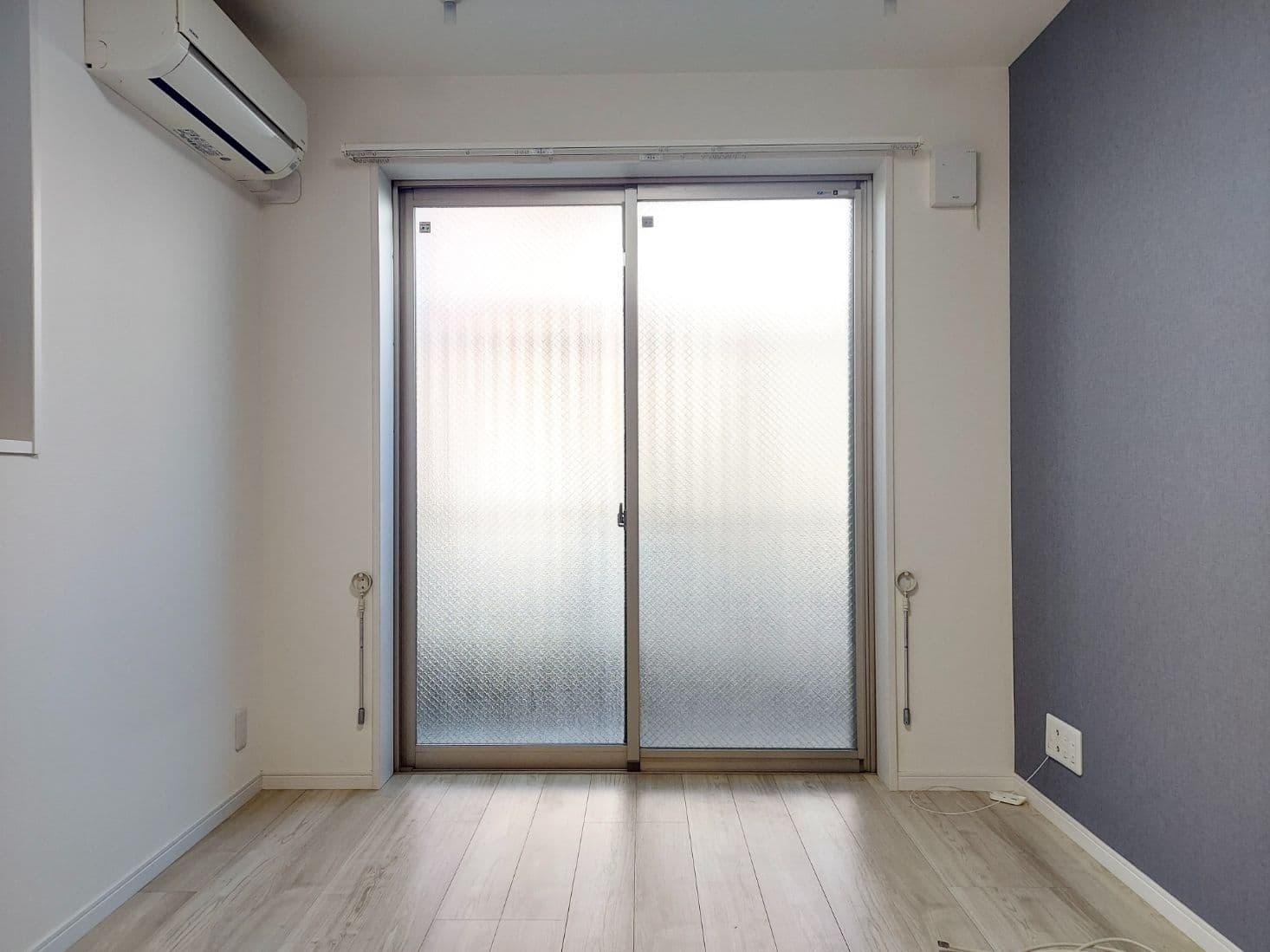 青色の壁がアクセントの明るい1K