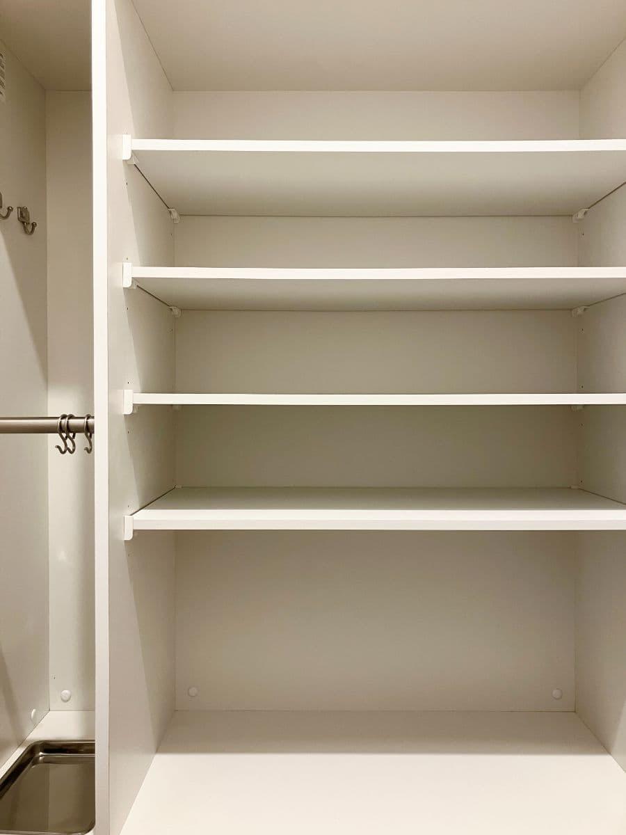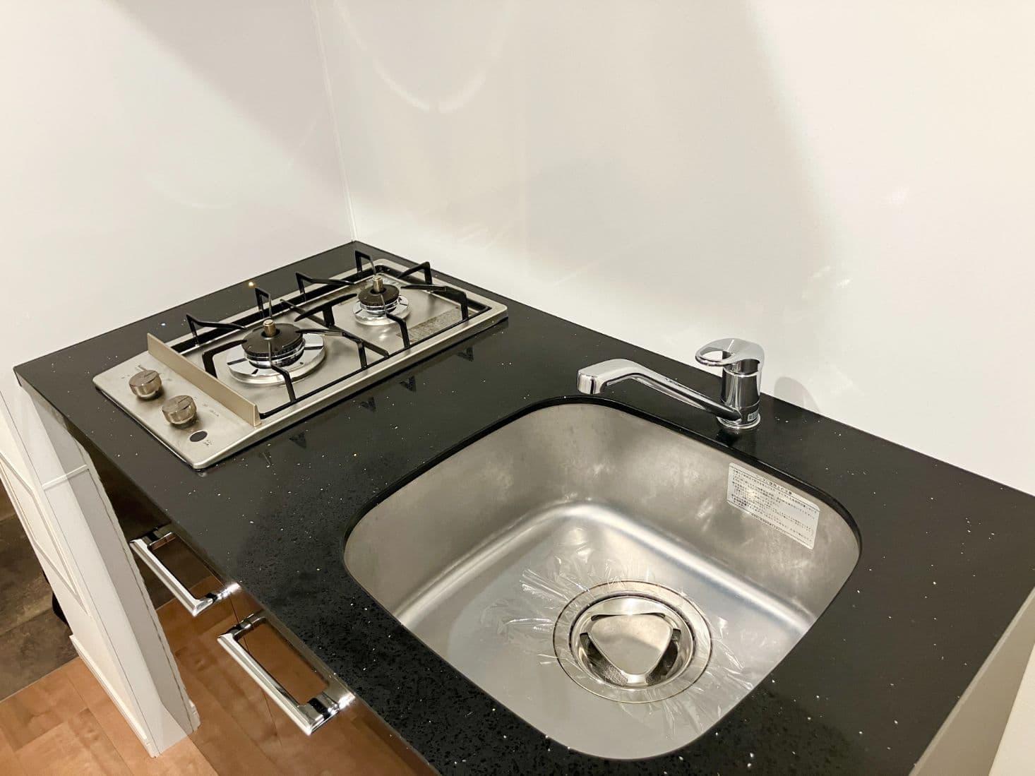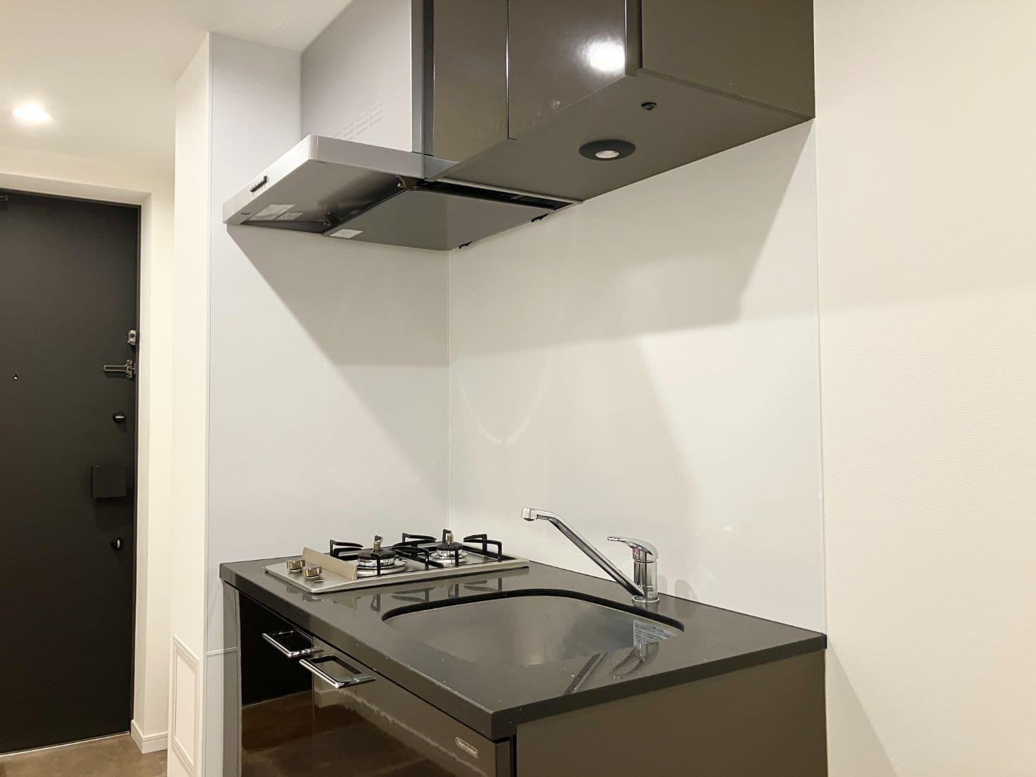 キッチンは白と黒のコントラストになっています、収納もばっちりです。