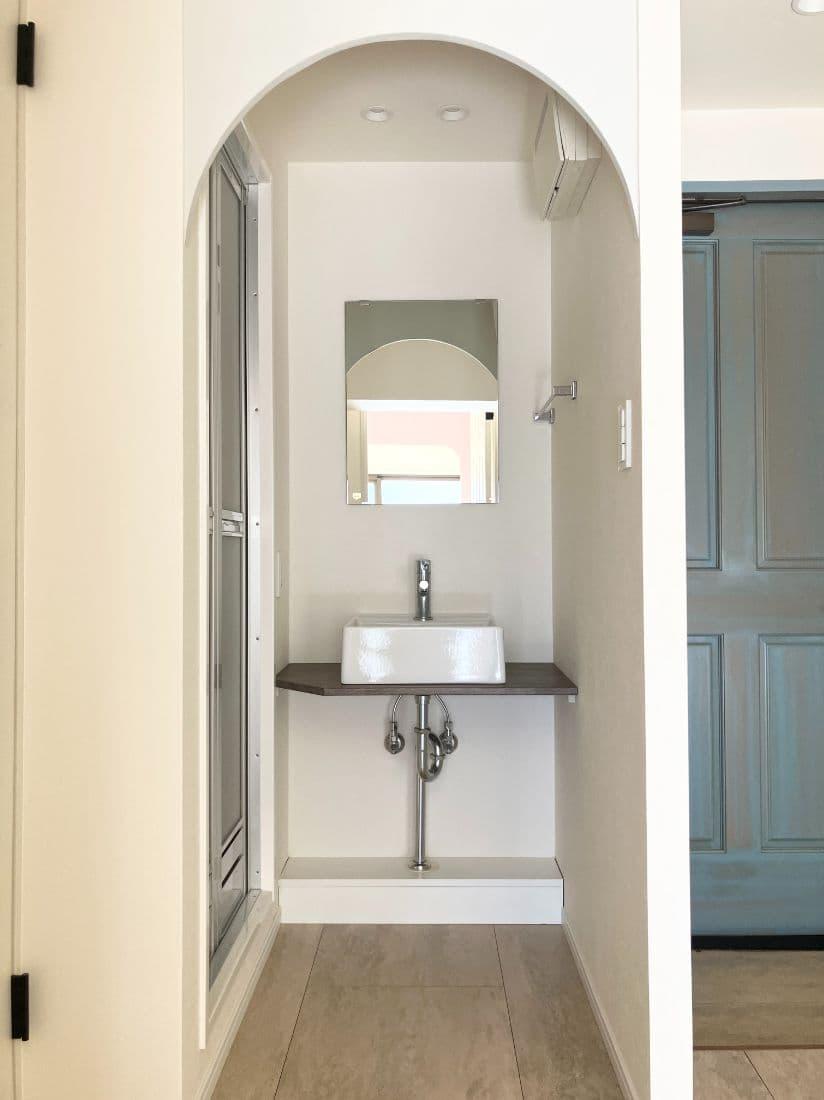 アクセントクロスや丸みを帯びた壁、フレンチスタイルの扉が可愛らしい空間です。