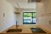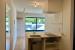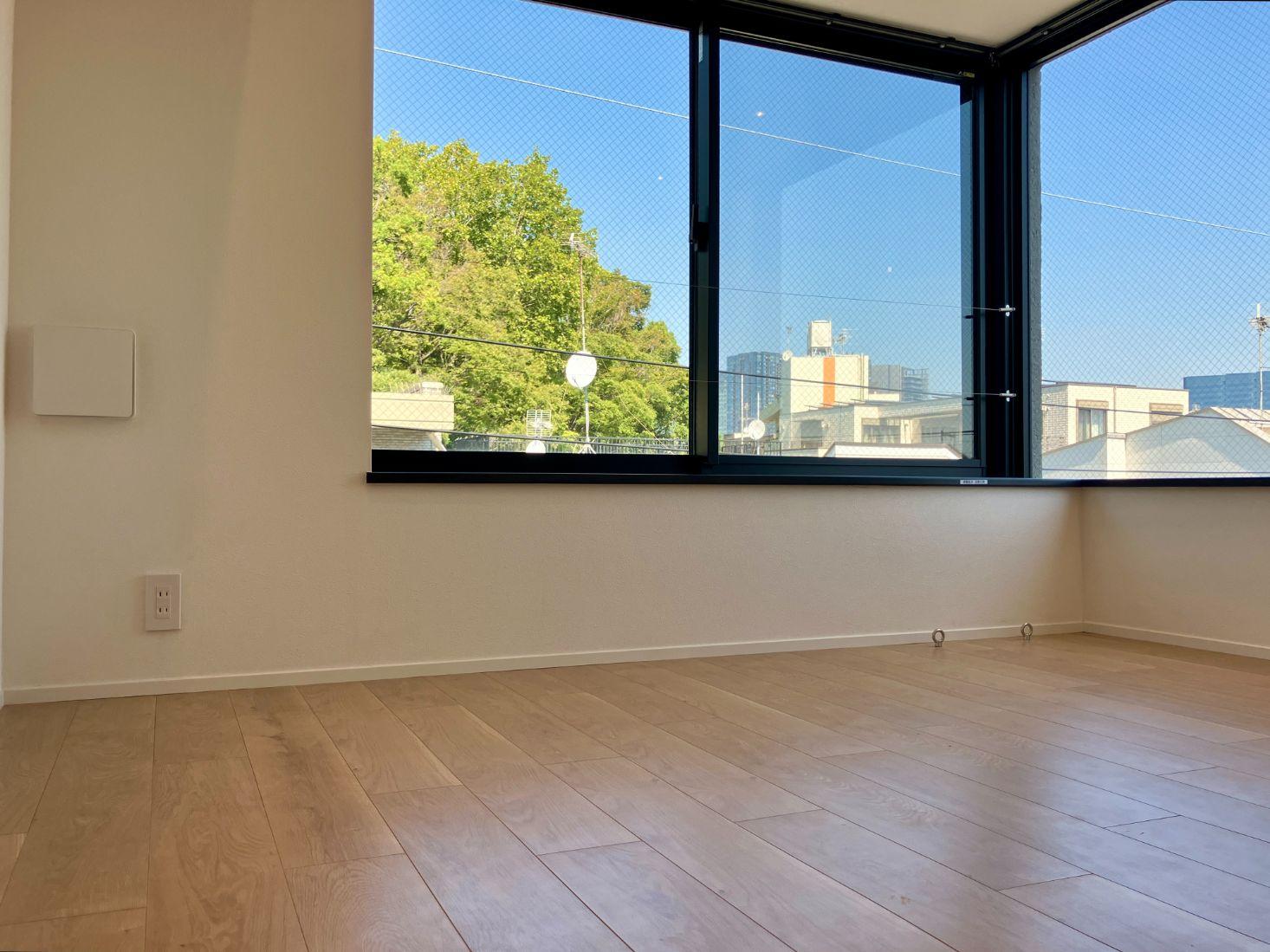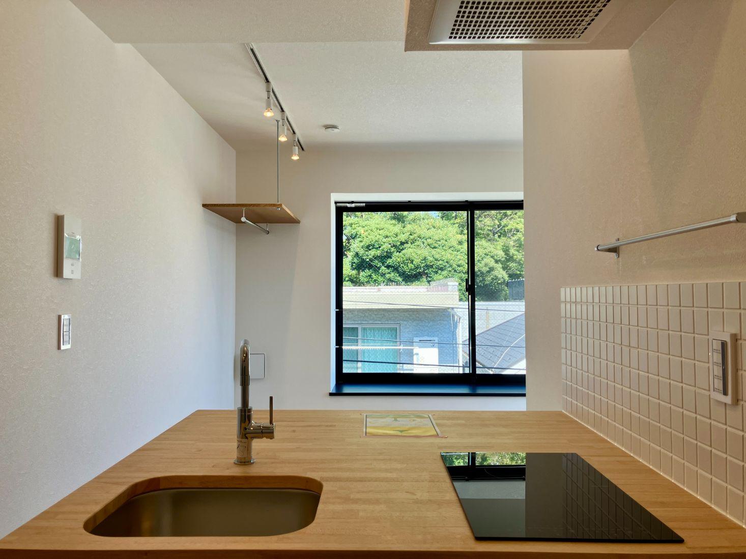 内装はナチュラルな木目調に統一されて、大きな窓から見える緑。