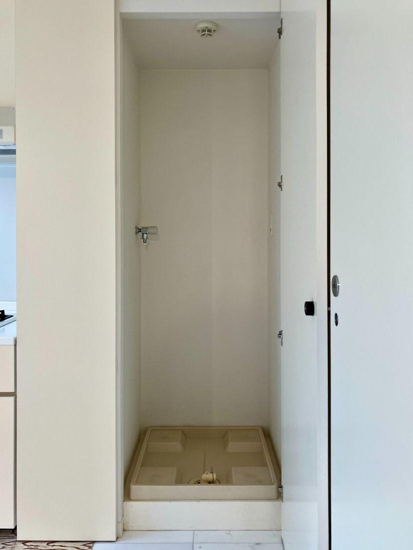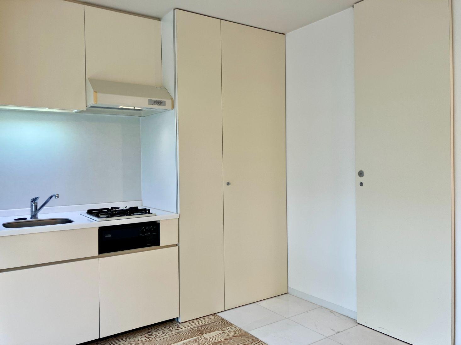 壁に面して設置された収納、キッチン、洗濯機置き場が、面一で収まっているのはなんとも美しい。
