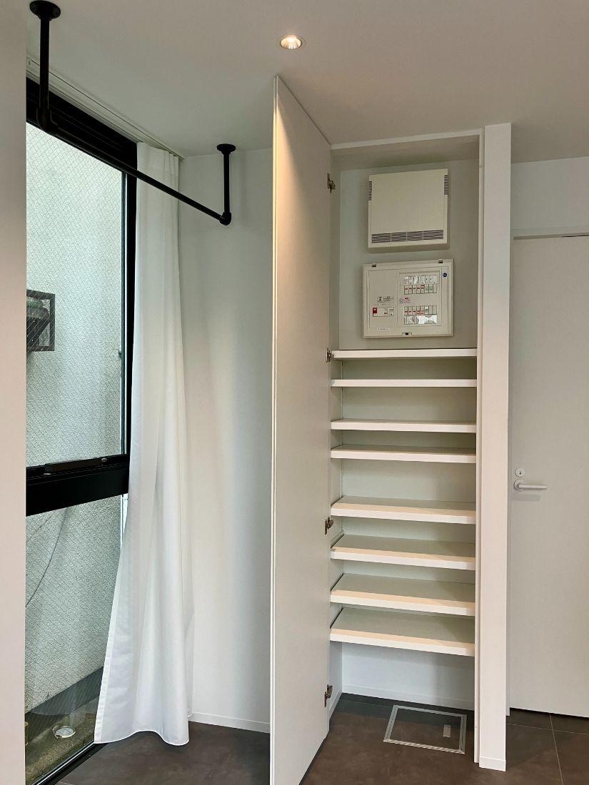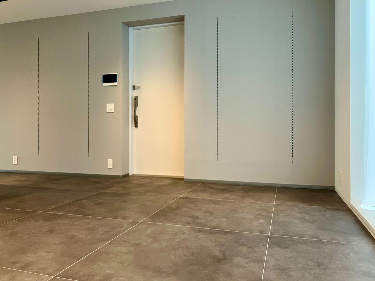 玄関スペース。壁は棚柱が埋め込まれており、棚板やハンガーパイプを設置できます。