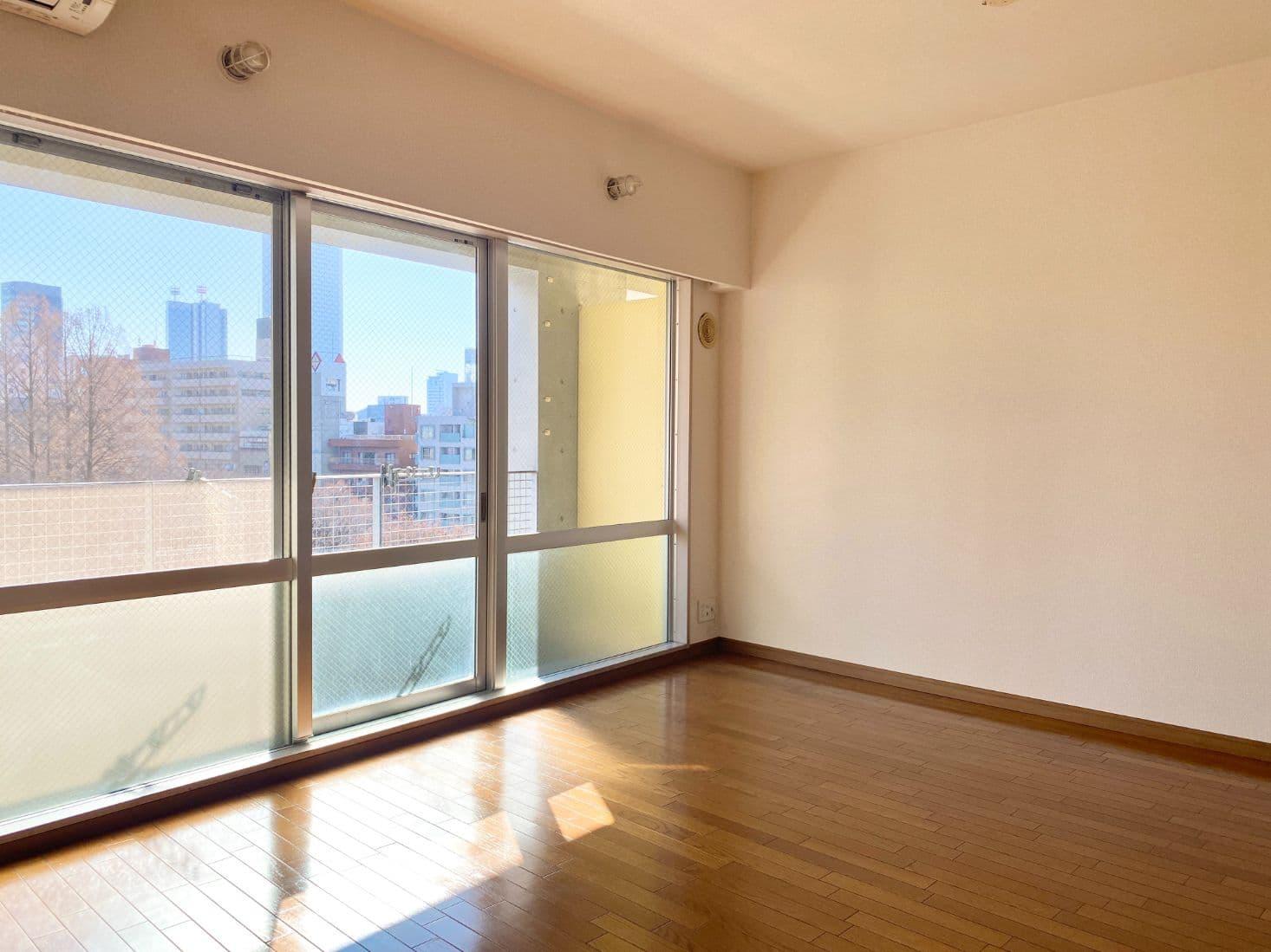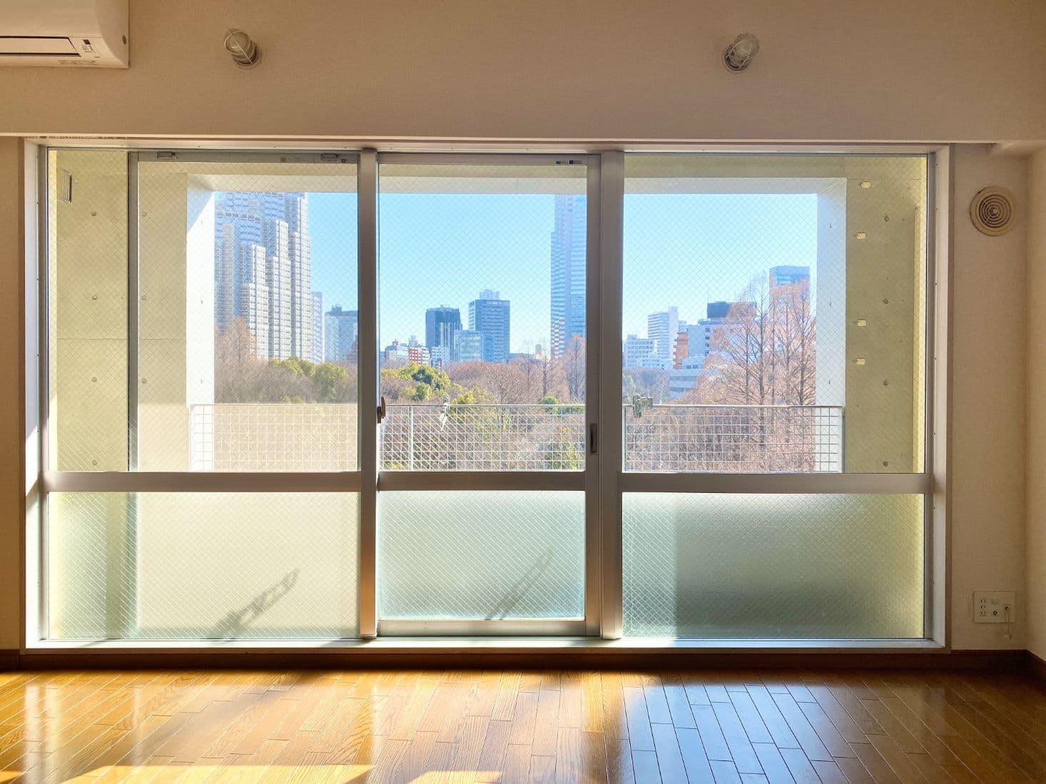 潔いワンルーム、その最上階のお部屋に備えられたワイドスパンの窓の先には、都庁と新宿中央公園の景色が広がります。
