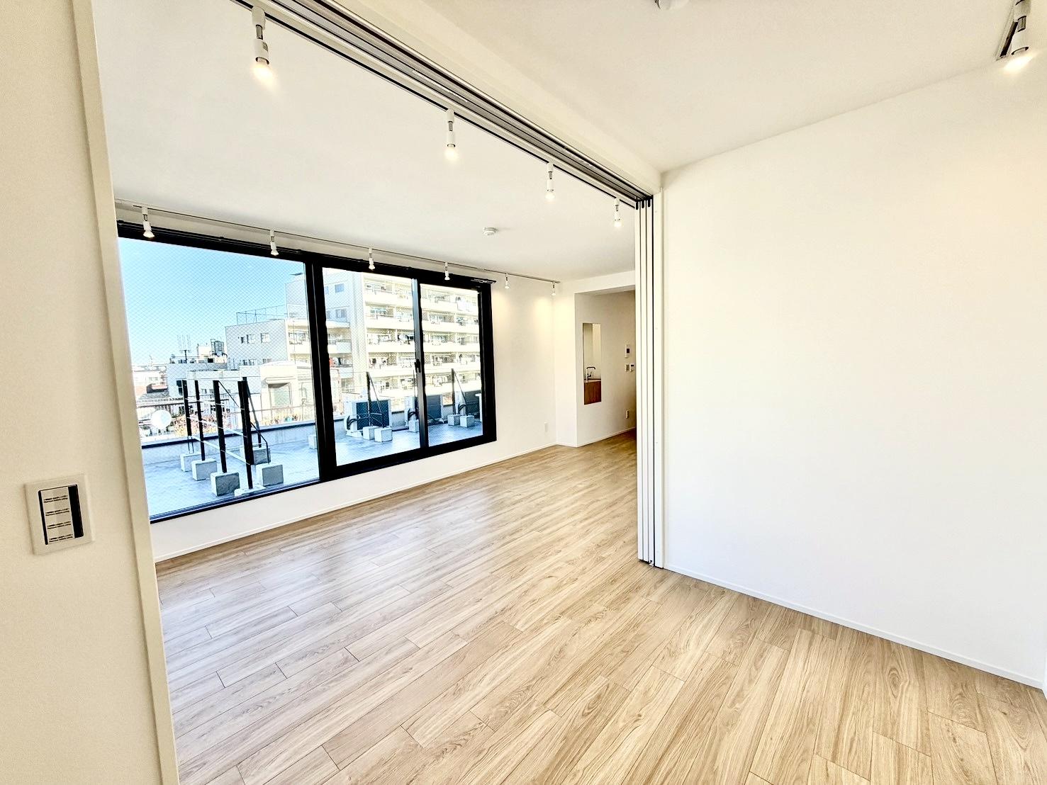 このお部屋の面白いところは、リビングと洋室を仕切る大きなスライディングウォール。
