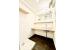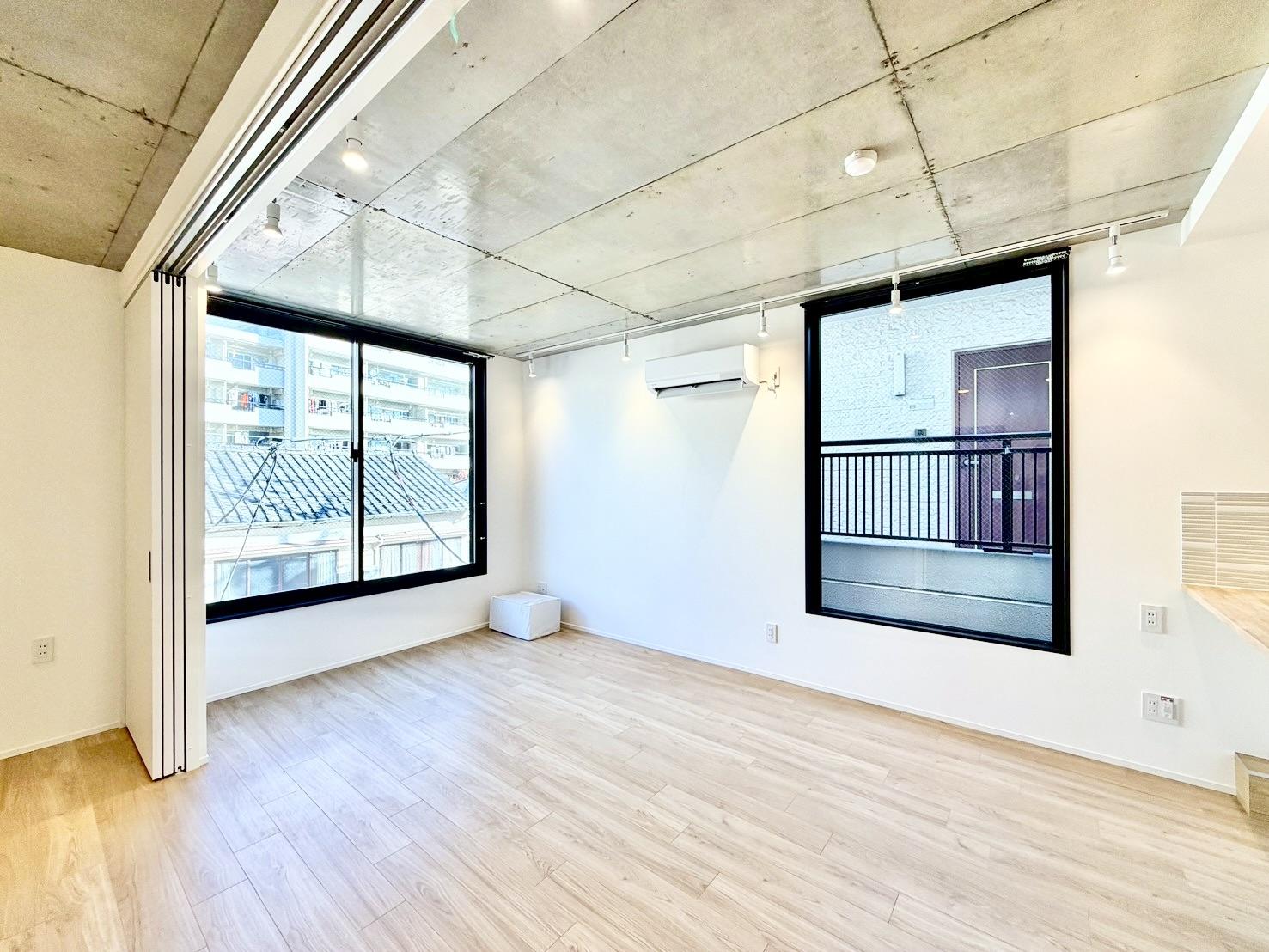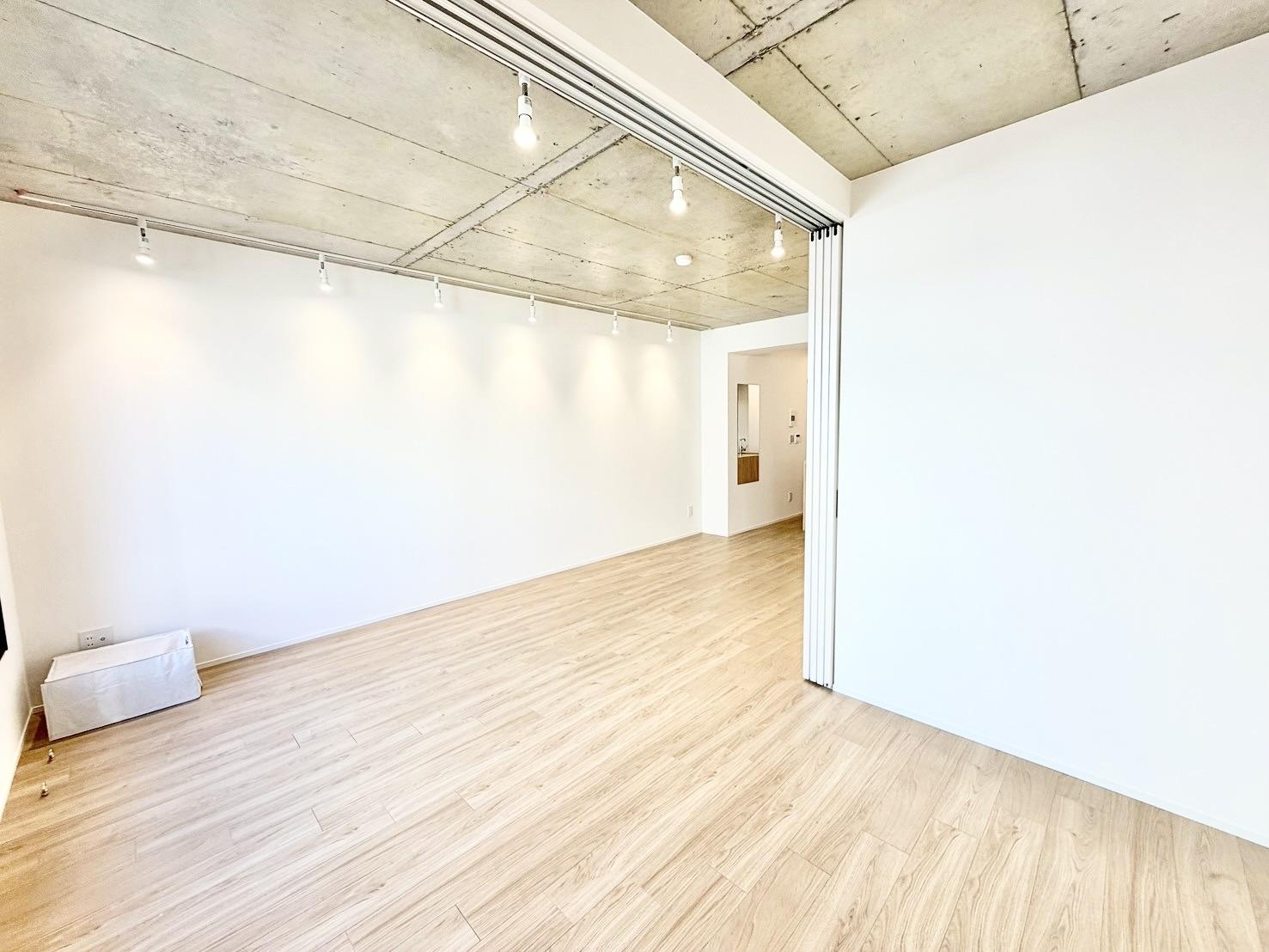 お部屋のドアを開けて、まず目に飛び込んでくるのは、コンクリート打ちっ放しの天井。インダストリアルでクールな印象ですが、床材やキッチンのカウンターには温かみのある木が使われていて、絶妙なバランスを保っています。照明はライティングレールなので、気分や家具の配置に合わせて好きな場所を照らせるのも嬉しいポイントです。