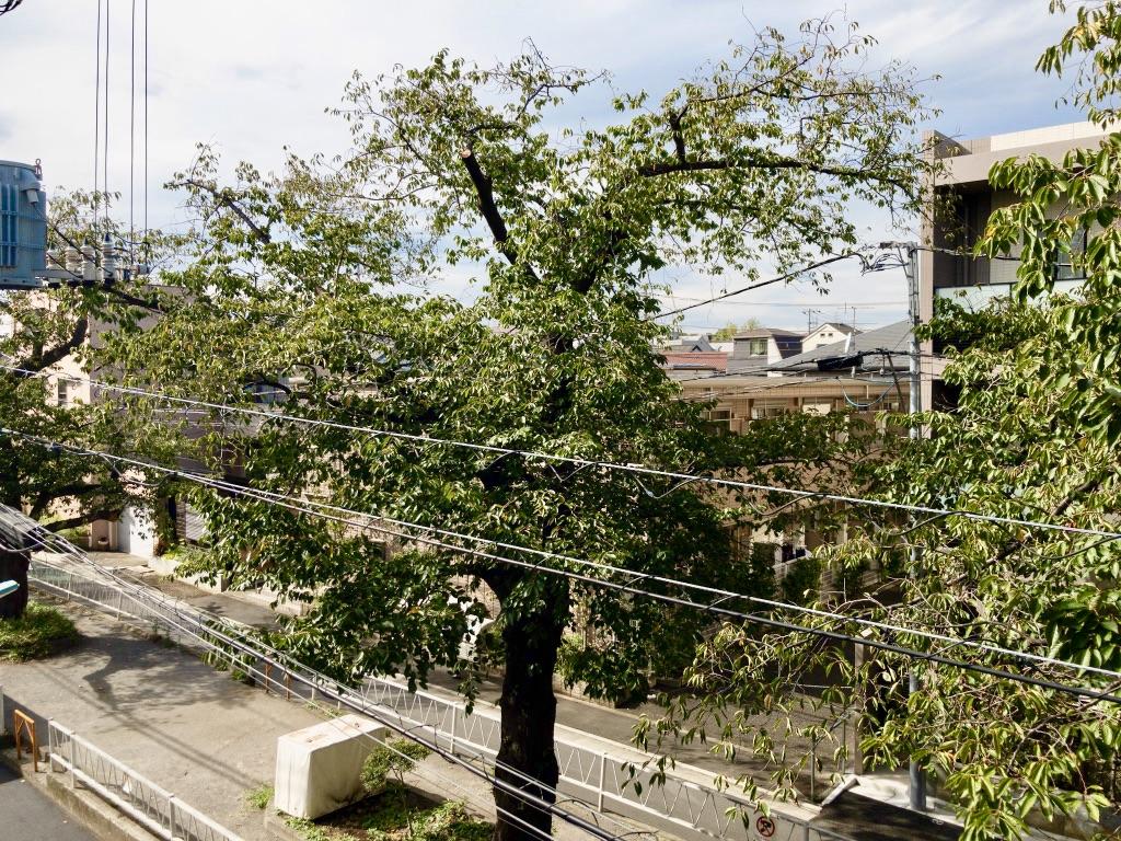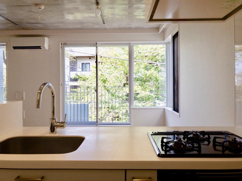 リビングの窓に惜しみなく映り込む緑道の緑。