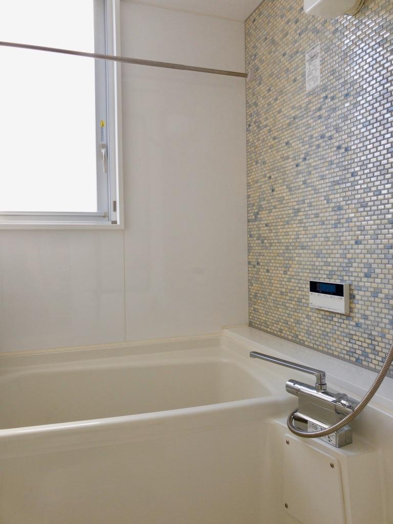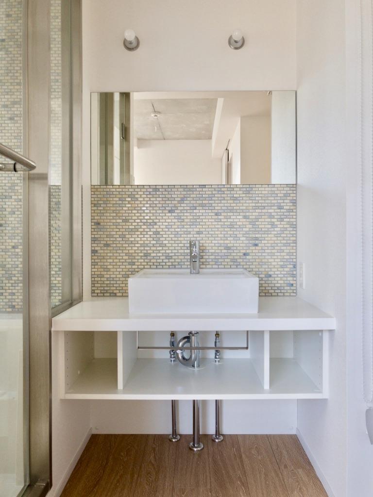 モザイクタイルをちりばめた洗面台とバスルームにも、